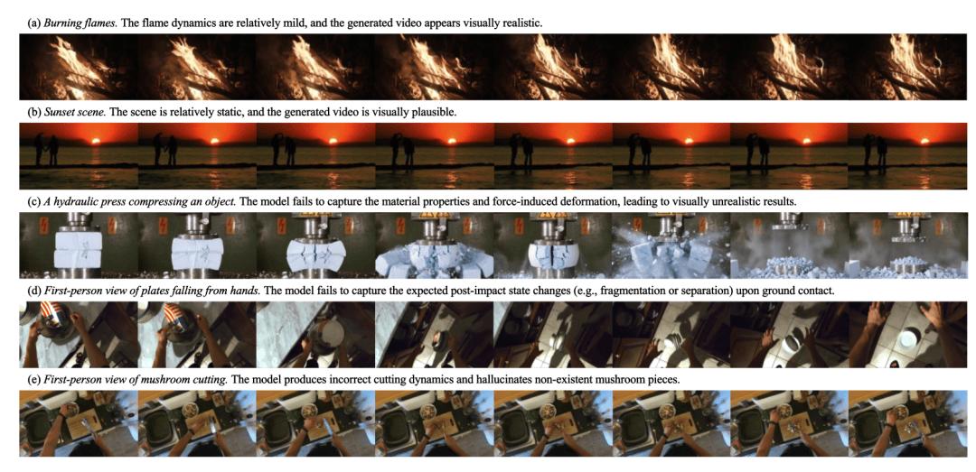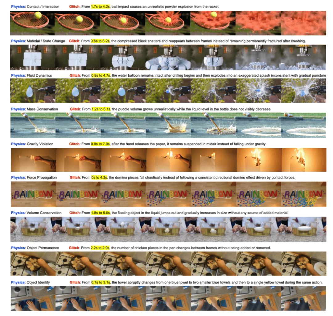而且这些错误不是零零散散的小毛病,而是系统性的。论文里总结的典型问题包括:接触或交互失败、对象突然出现或消失、时间连贯性崩塌、因果顺序错乱、材料或状态变化异常、几何碰撞不合理等等。换句话说,问题不只是 “画面有点假”,而是模型对物体、接触、运动和结果之间最基本的关系,还经常搞错。