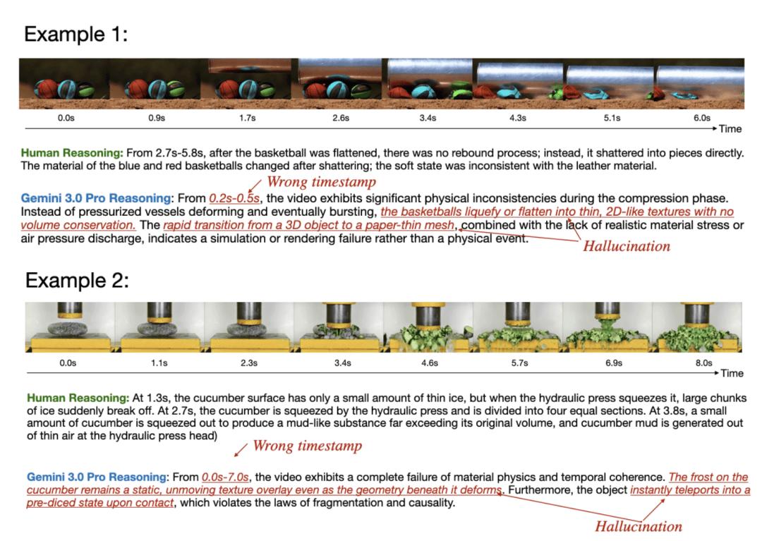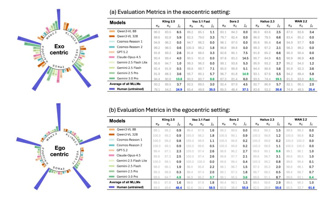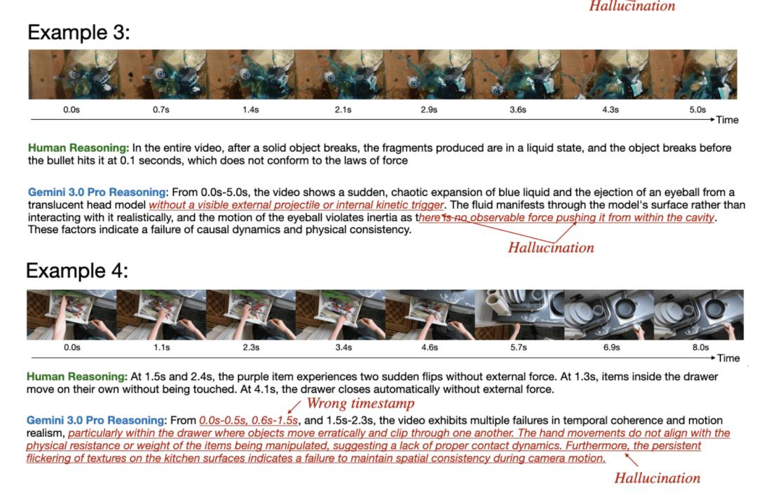 在这一过程中,人类智能所展现出的优势尤为明显:人类不仅能够识别视觉上的异常,更能够基于物理直觉与因果理解,对复杂的动态过程进行推理和解释。相比之下,即使是当前最先进的多模态模型,在时序一致性、交互合理性以及隐含物理规律的判断上,仍存在明显不足。