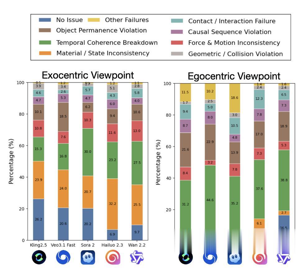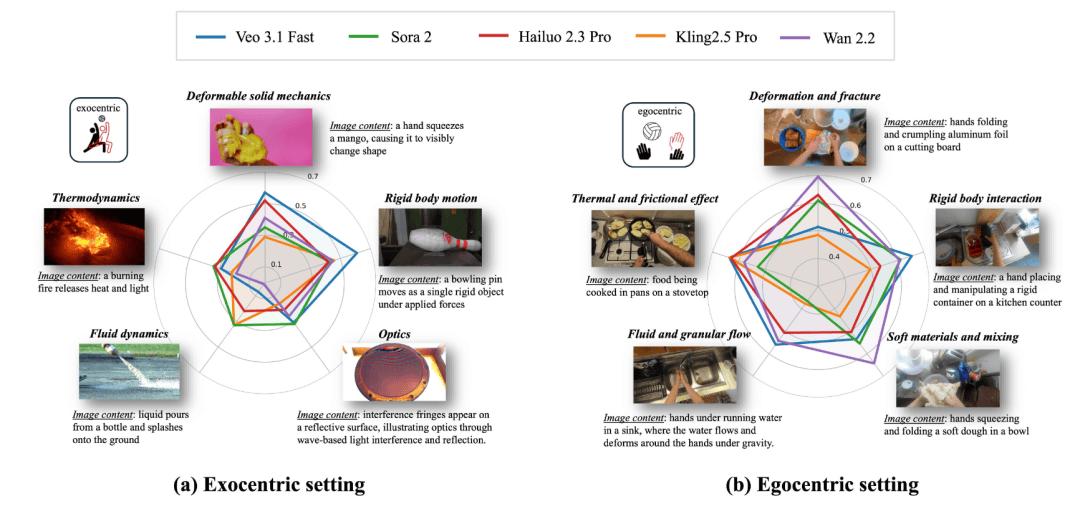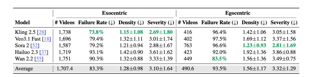 这篇工作的主结论其实很简单,也很扎眼:在物理过程敏感的场景里,83.3% 的第三人称生成视频和 93.5% 的第一人称生成视频,都至少包含一个人类可以明确识别的物理错误。这说明什么?说明今天的视频模型确实越来越会制造 “真实感” 了,但离 “真正符合物理规律” 还有很远。