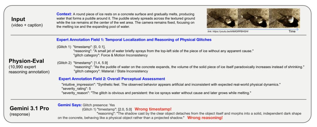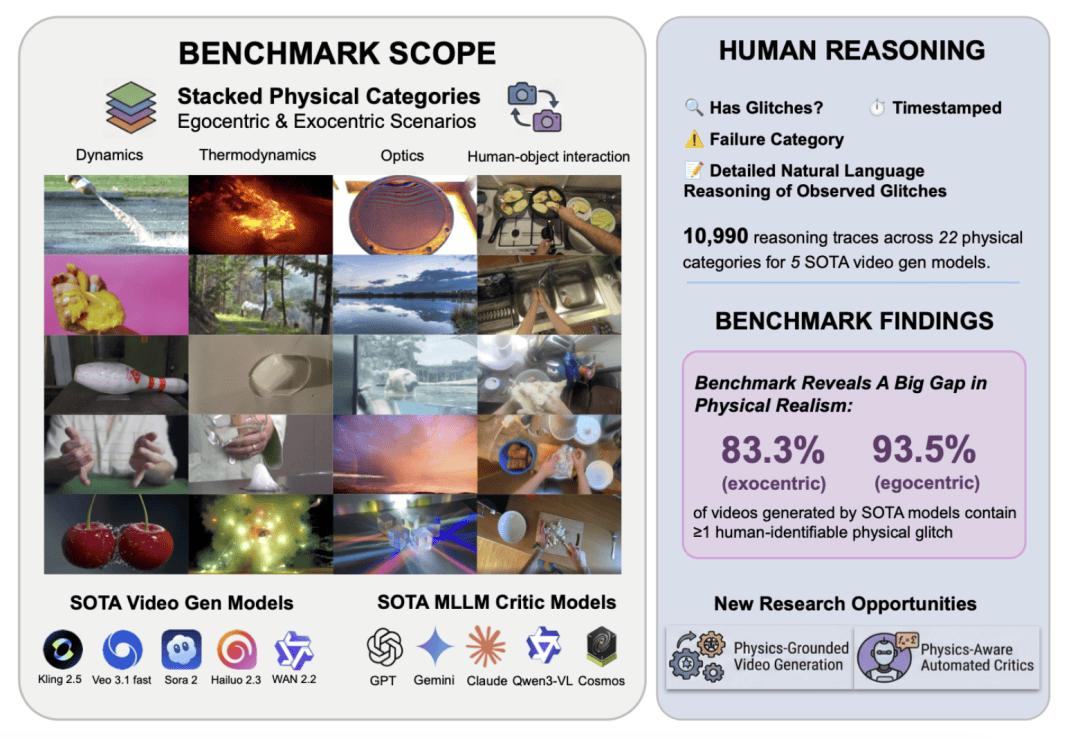 这个 benchmark 同时覆盖第一人称和第三人称场景,包含 10,990 条专家推理轨迹,覆盖 22 类细粒度物理现象。和常见评测不太一样的地方在于,这里的每条样本不只是简单打个分,而是会标出错误发生在什么时候、属于哪一类问题,以及为什么不对。