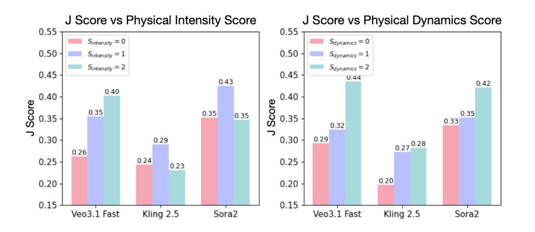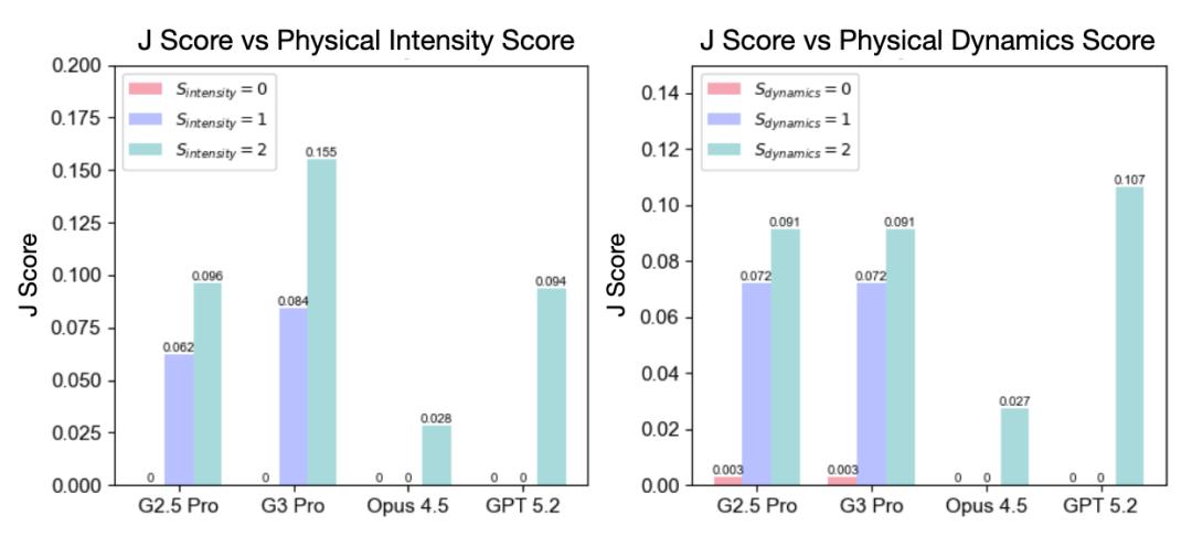 论文进一步从 physical intensity 和 dynamics 两个维度分析了生成模型与市面上已有的 MLLM critic 的表现。结果表明,相比强度大小,过程本身的动态性和复杂性更容易暴露视频生成模型的物理建模缺陷。对 MLLM critic 来说也是如此:只有当错误足够明显时,它们才会表现出有限的判断能力,但整体仍明显落后于人类。