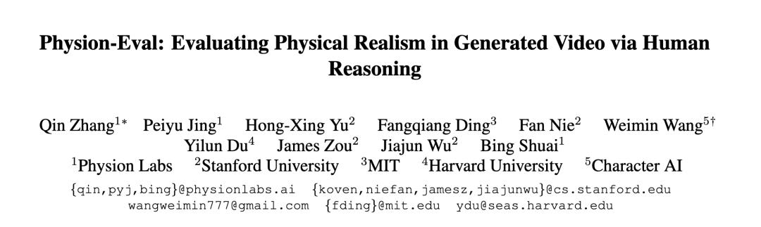 本文由来自美国顶级科技公司与世界一流高校的豪华作者阵容共同完成,集结 Physion Labs、斯坦福大学、MIT、哈佛大学及 Character AI 的核心研究者。其中,Physion Labs 团队(Qin Zhang、Peiyu Jing、Bing Shuai)长期专注于生成式视频与世界模型中的物理一致性问题,构建了面向行业的评估基础设施与数据闭环,致力于成为下一代生成模型的 “物理可信层”。其余作者包括斯坦福大学的 Hong-Xing Yu、Fan Nie、James Zou、Jiajun Wu,麻省理工学院的 Fangqiang Ding,哈佛大学的 Yilun Du,以及 Character AI 的 Weimin Wang 等业内顶尖学者。
