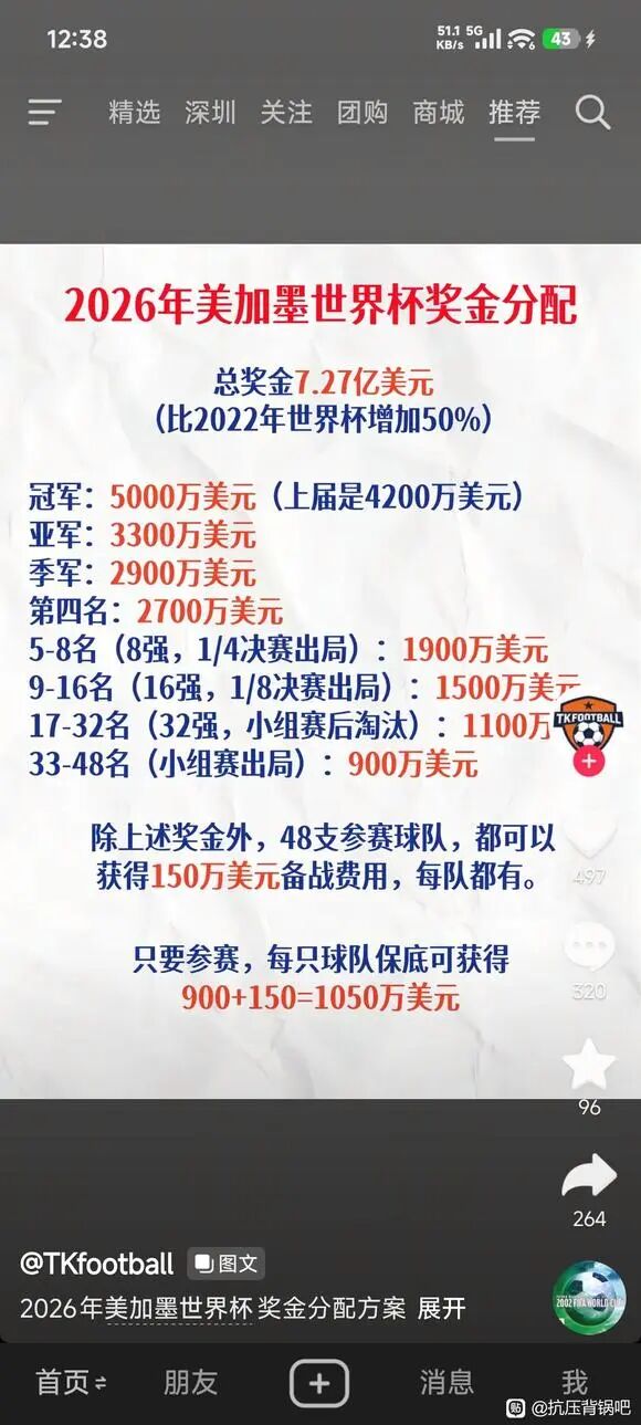 创纪录!美加墨世界杯的奖金和补贴达7.27亿美元。冠军奖金5000万美元,最后一名也有900万美元。