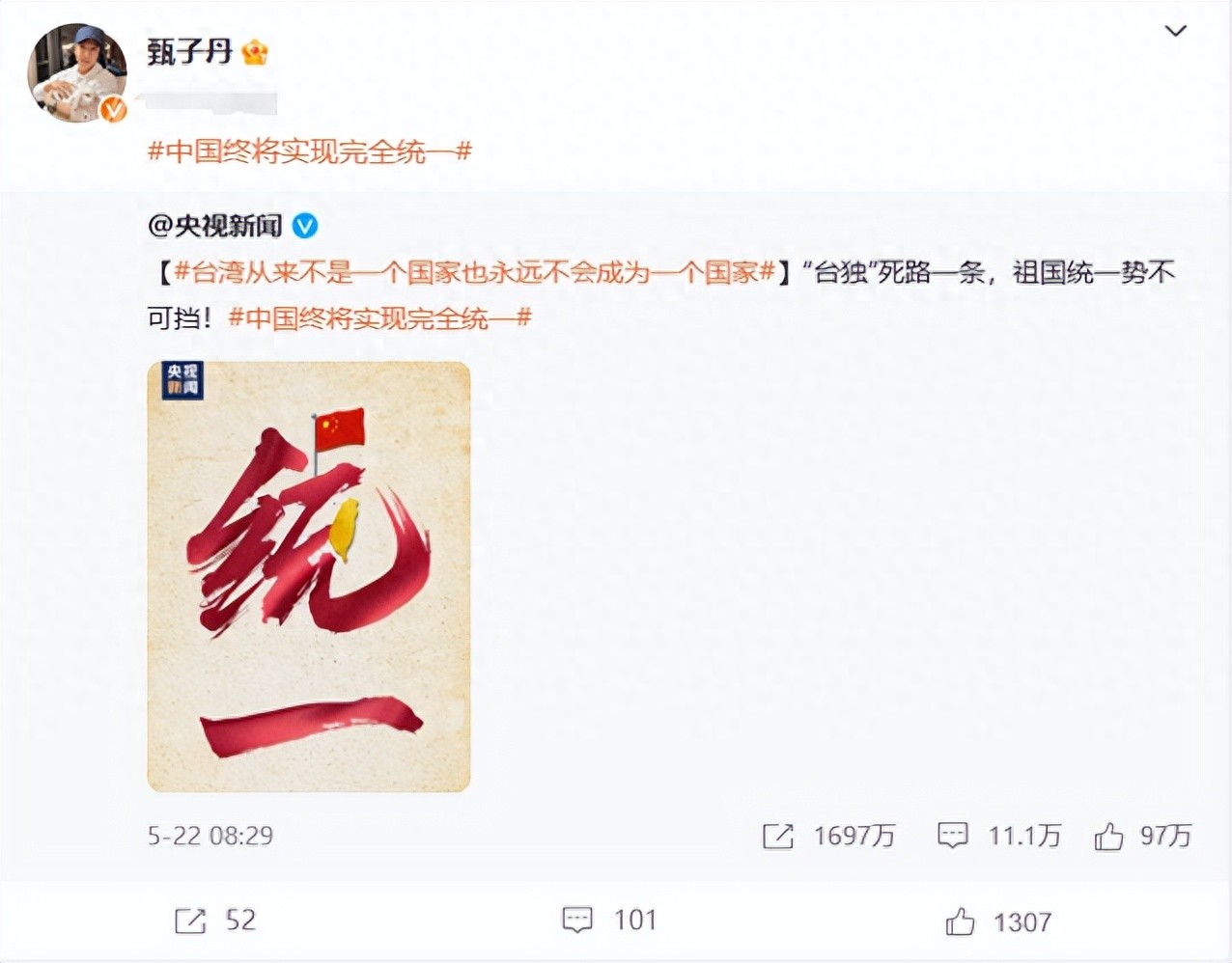 “祖国统一势不可挡”的相关内容,张韶涵、周传雄、杨宗纬、欧阳娜娜、王嘉尔....等多名港台艺人转发。