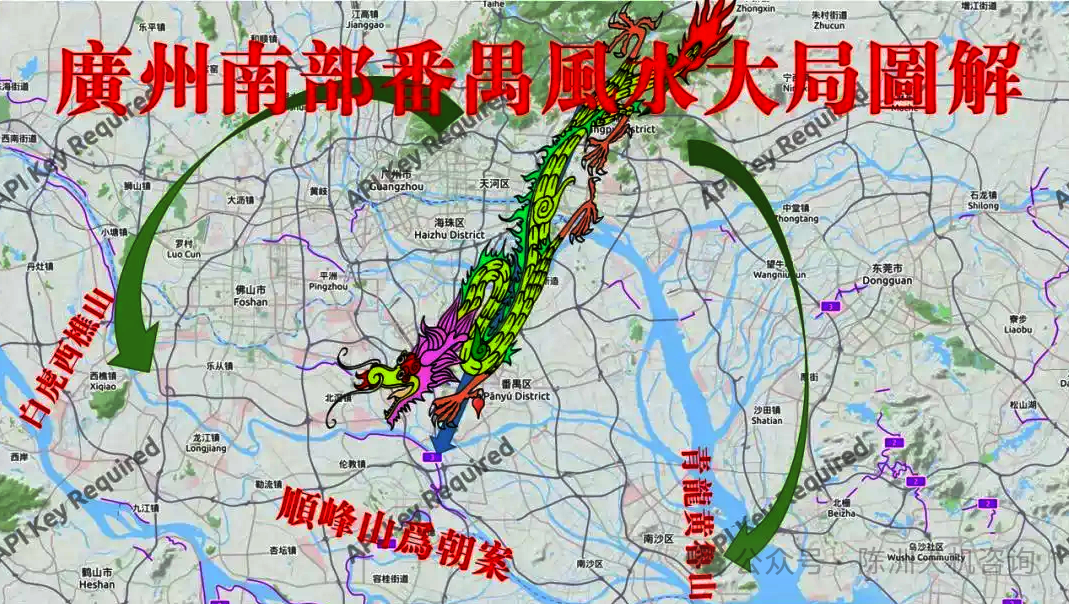 番禺区的龙脉与风水大局:要理清番禺的龙脉与风水格局,就要先了解广州中心(海珠区)市区的龙脉来源,风水龙脉看法诀窍:看龙先看水,龙脉的延伸,必有水源伴随着龙脉延伸而流行,也即是龙脉往那处方向延伸游走其左右就必会有一条水流伴随龙行的方向流动,所以水流的源头也就是龙脉的来源地头,从整个广州市的水流源头而论,龙脉源头就是来自于东北方位朝西南方向引伸至白云山是天河区的龙脉源头,至越秀山朝西南方向辐射引伸的是市中心海珠区的龙脉源头,而番禺区的龙脉来源则是来之于萝岗从大学城皇家圣地渡江经南村、大夫山到沙湾滴水岩森林公园牛头岗。广州的海珠中心城区及天河区传统的龙脉走势是东北向西南方向延伸辐射属艮坤格局,而番禺的龙脉走向也同样呈东北向西南方向延伸辐射也属艮坤格局,只是龙脉来源的分脉不同而已。从大局风水论可知,番禺的来龙源之于萝岗、朝案是顺德的顺峰山,水出于南沙后汇入海。
