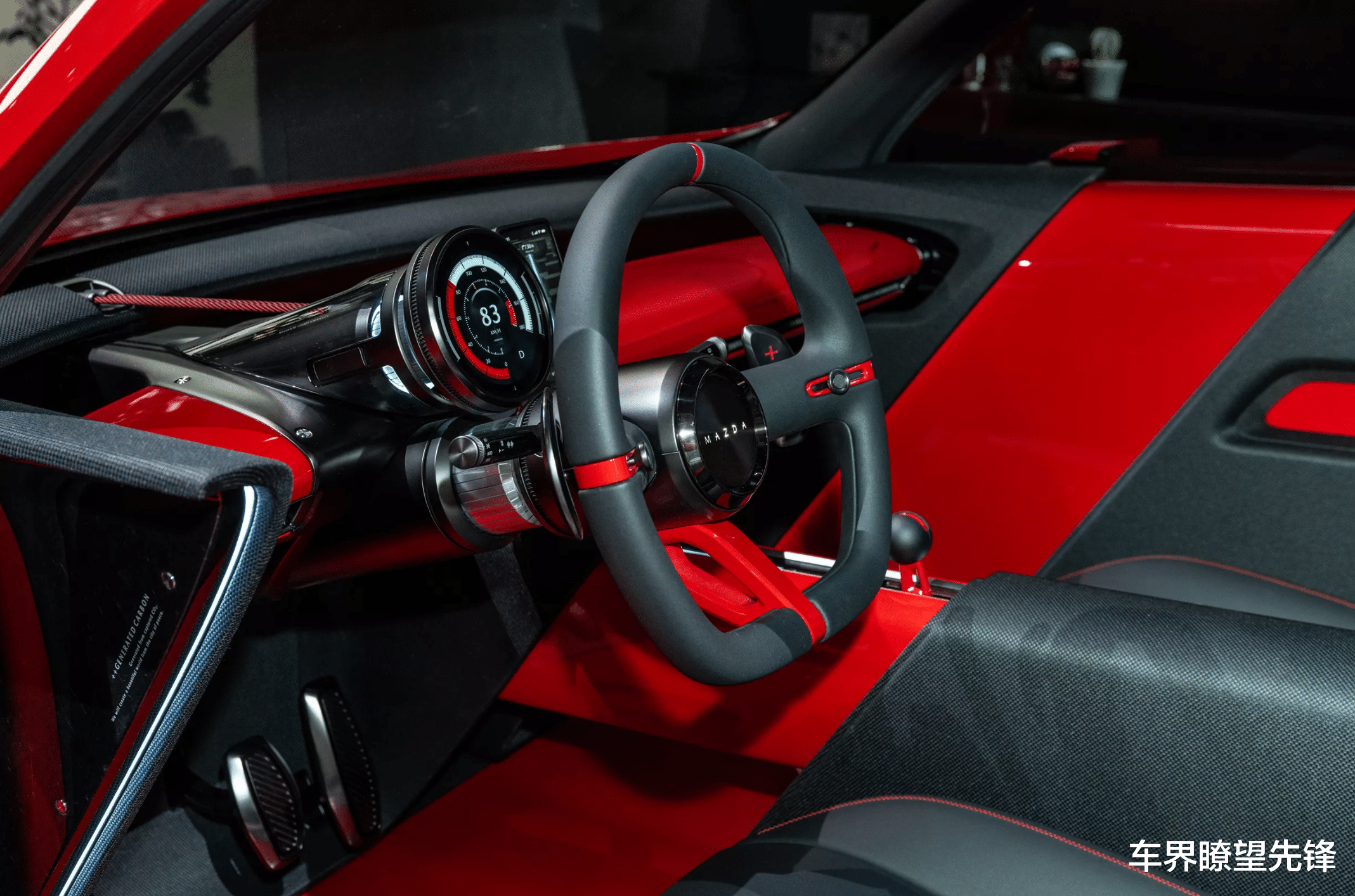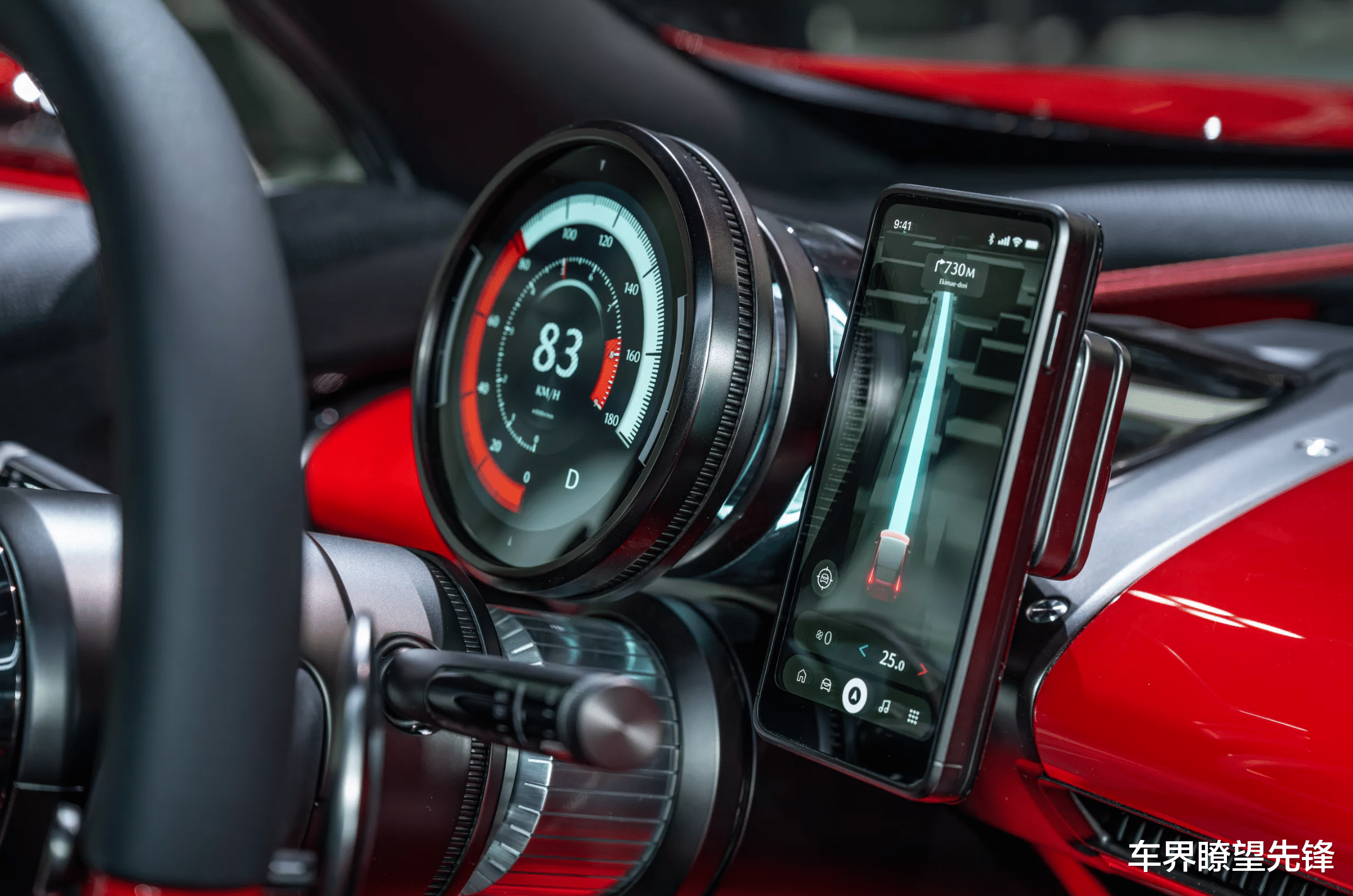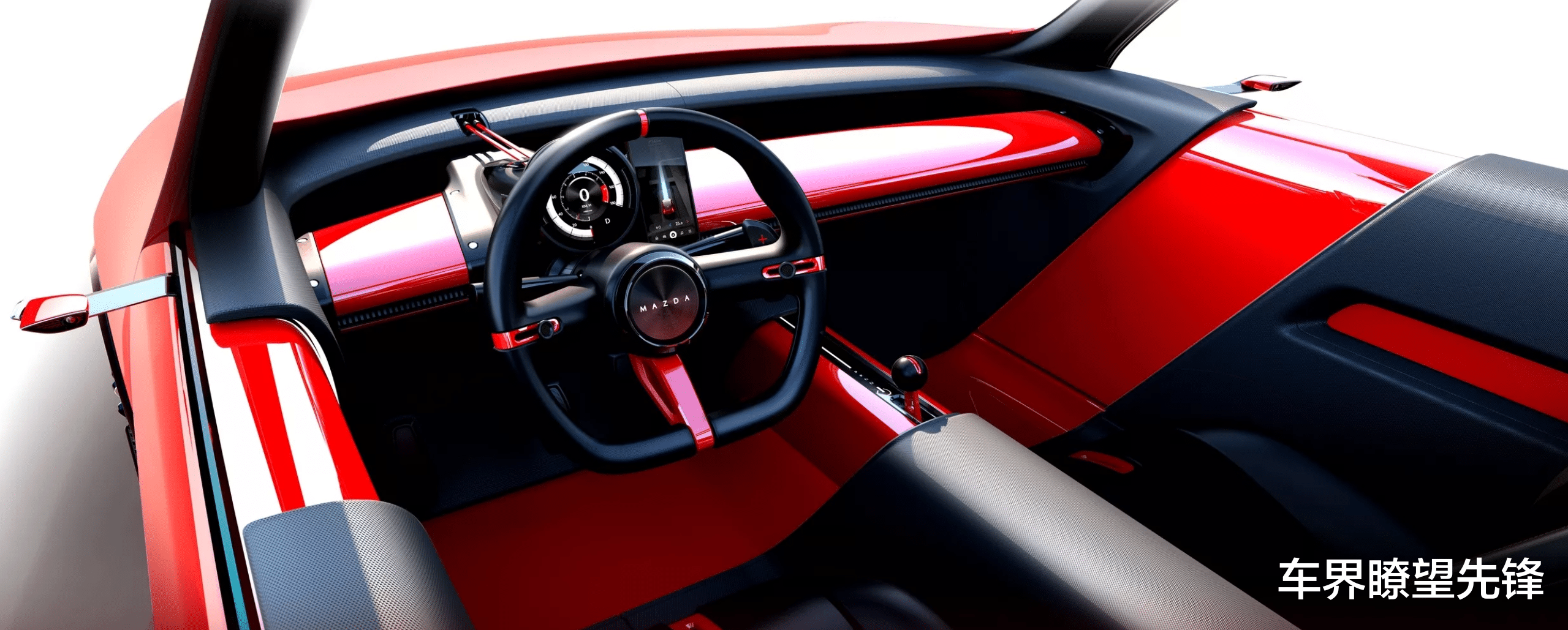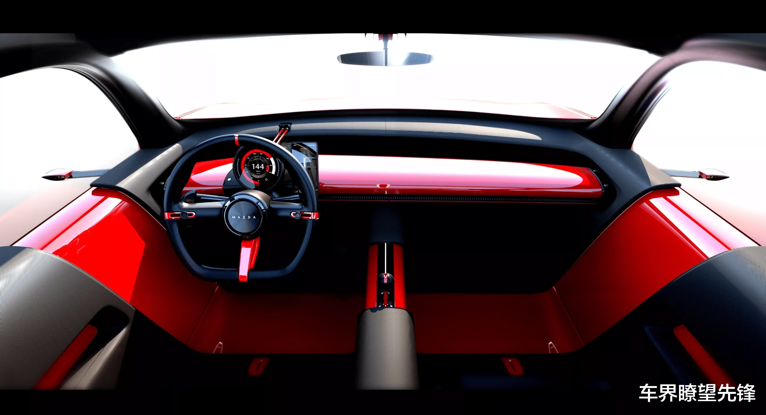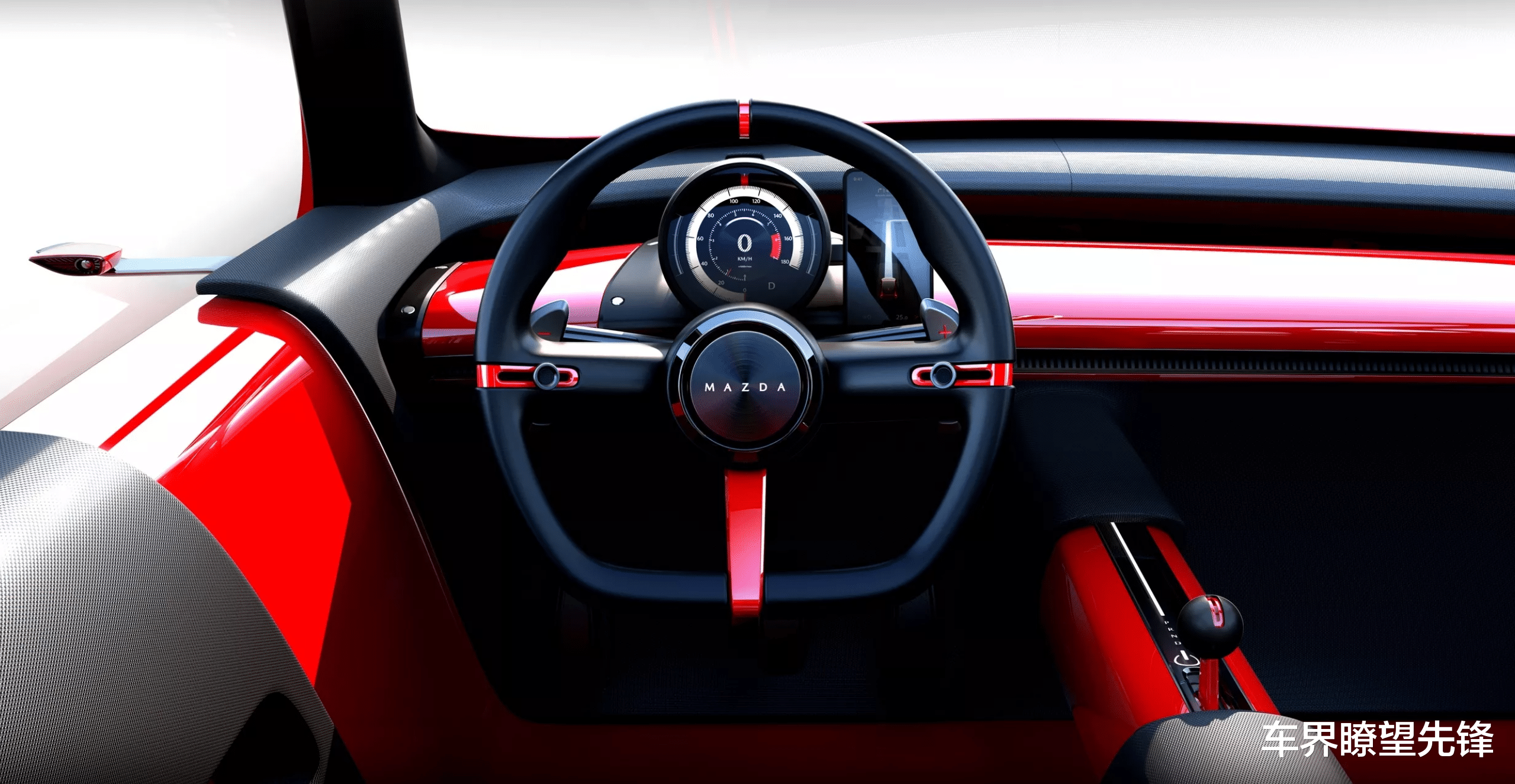 虽然是概念车,但内饰却采用了极度简洁的设计,但整体看上去还十分有科技感,方向盘为极简的三幅式,利用了黑色+红色的搭配十分亮眼,而方向盘上没有任何功能按钮,中间是马自达的字母标识。整个座舱只配备了一个圆形的数字仪表盘,没有配备任何尺寸的中控屏,但应该是配备了一个手机支架,用来放置智能手机做导航以及其他用途。