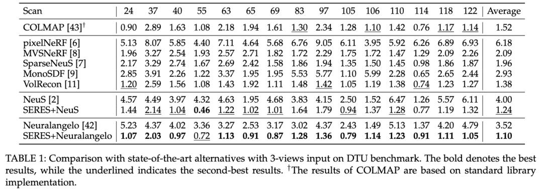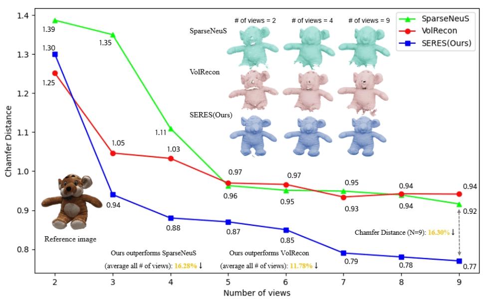 在 DTU 的稀疏多视角设置中,SERES 作为训练期插件显著提升了重建质量与新视角合成质量。与主流基线相比,画面质量指标在多组场景中全面优于对应的原始主干,同时几何误差在从极少到较少视角的范围内稳定下降。随着视角数从极少逐步增加,误差的下降趋势依旧保持,说明这套先验与正则对不同稀疏程度都有稳定收益。