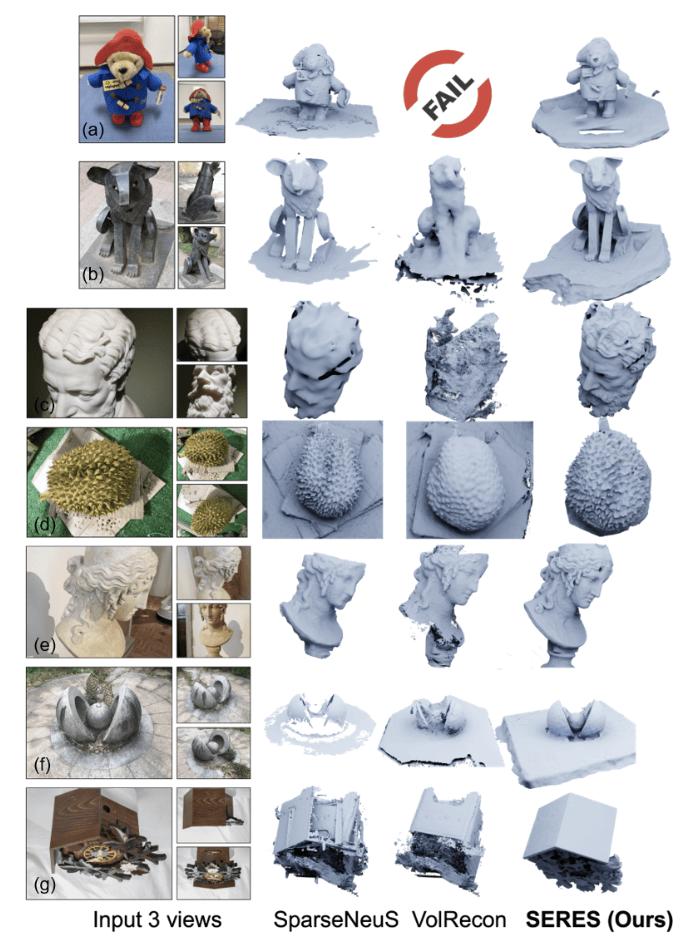 表面重建的核心挑战,在于在少量视角下同时兼顾几何准确性、细节还原与结构完整性。现有神经隐式路线,在样本稀疏时容易出现跨视角对应不稳、边界发糊、局部缺失等现象;当可见区域有限、纹理不明显、遮挡复杂时,这些问题会被进一步放大。