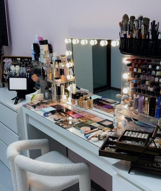 在学校的"实战训练中心",我们看到了更令人震撼的场景:完全仿照各大影楼、婚庆团队一比一复刻的化妆环境、配备顶级化妆装备的工作台......