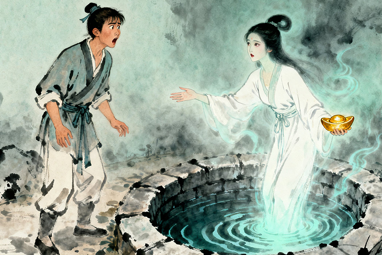 路过那口枯井时,忽听井中传来幽幽的呼唤:“二狗...二狗...”赵二狗浑身一激灵,这声音太熟悉了,是云秀!他吓得倒退几步,想跑,却听井中声音又道:“井下有金子...拉我上去,金子都是你的...”。金子?赵二狗的眼睛亮了。他想起老人们说过,冤死的人会知道地下的宝藏。云秀十分爱他,就算死了,也该念着夫妻情分吧?贪念压过了恐惧,他一步步挪到井边,探头望去。月光照进井底,只见云秀站在不及腰深的水中,面容虽浮肿,却带着温柔的微笑。她抬起手,手中果然有金光闪烁。“秀儿,我...我这就拉你上来。”赵二狗解下腰带,垂入井中。云秀抓住带子,赵二狗用力往上拉。奇怪的是,云秀轻得出奇,毫不费力就拉到了井口。