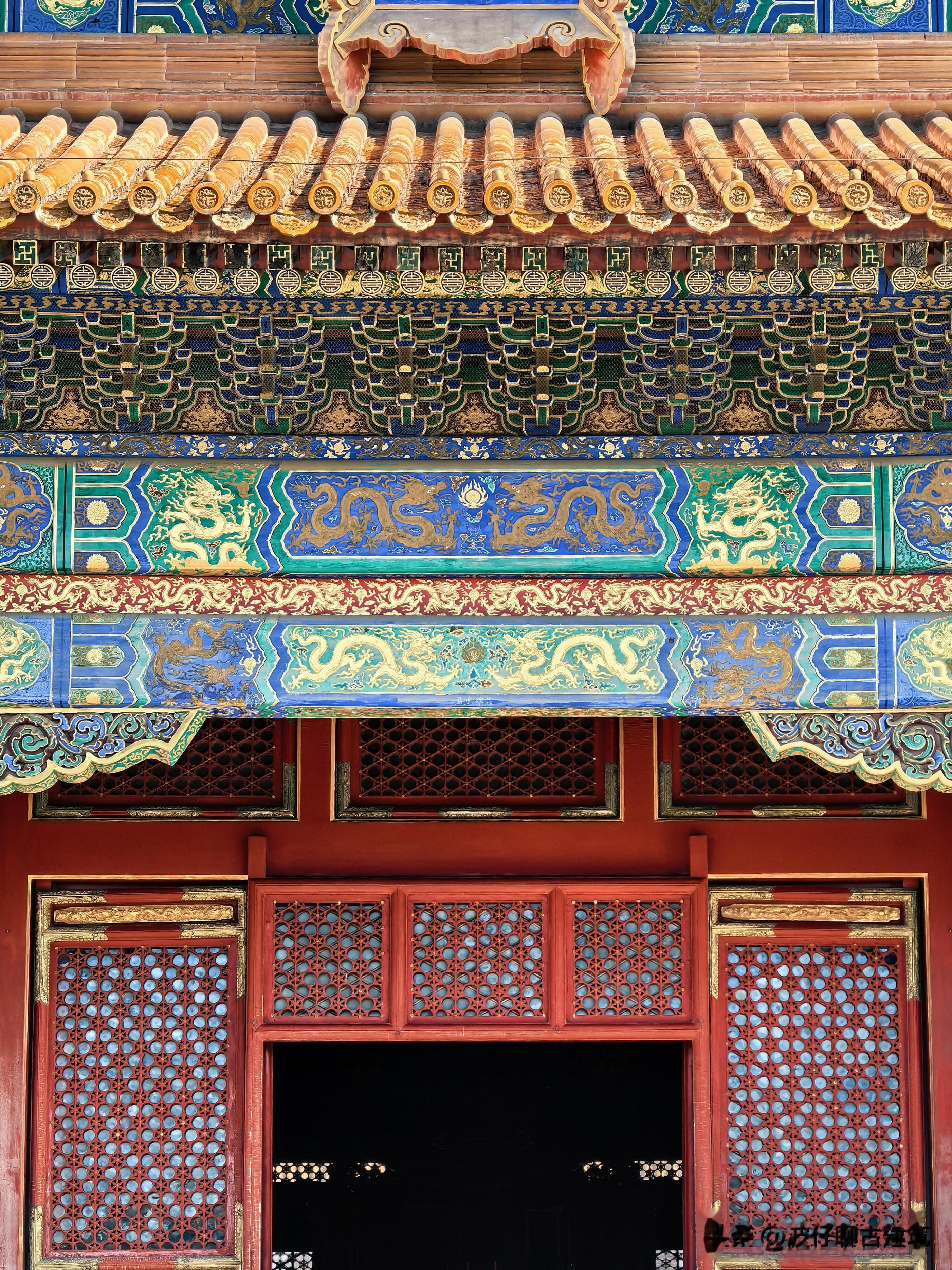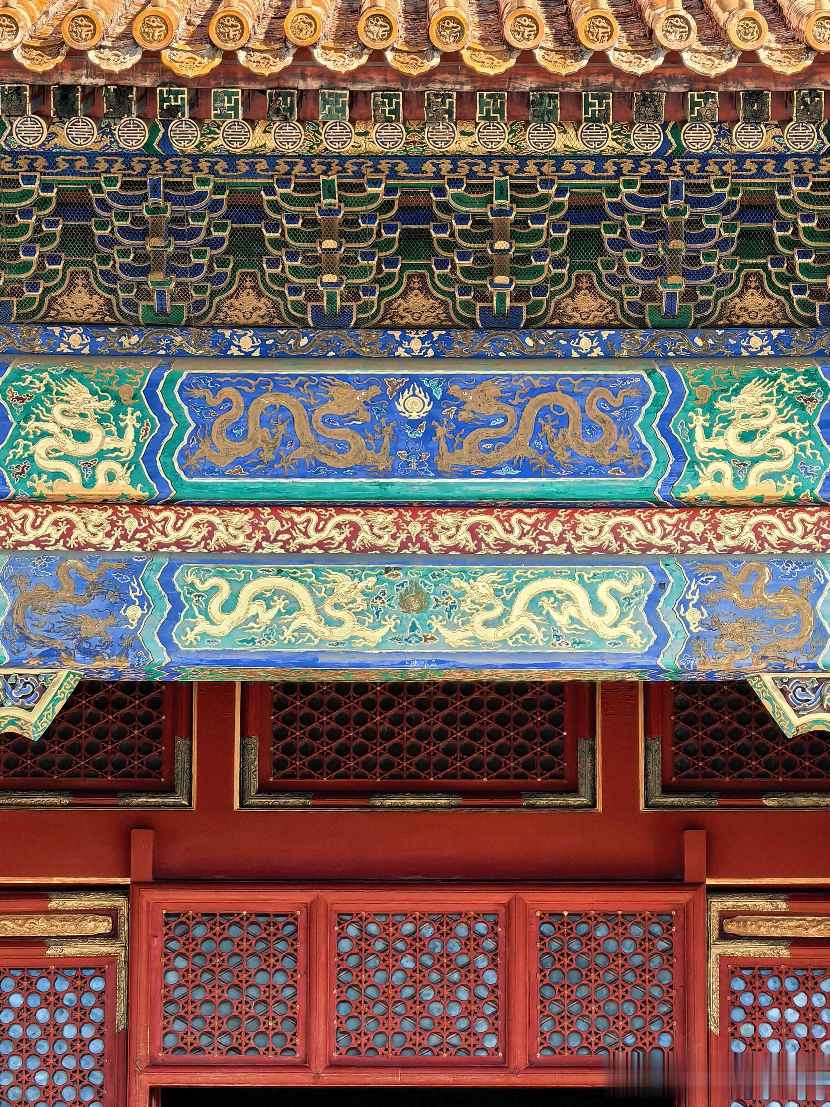 金龙和玺是等级最高、最为华贵的和玺彩画形式,其所有与龙相关的部位均绘以金龙,寓意“真龙天子”的绝对权威。这种彩画通常用于故宫外朝三大殿(太和殿、中和殿、保和殿)等最重要的宫殿建筑,是国家最高权力的视觉中心。