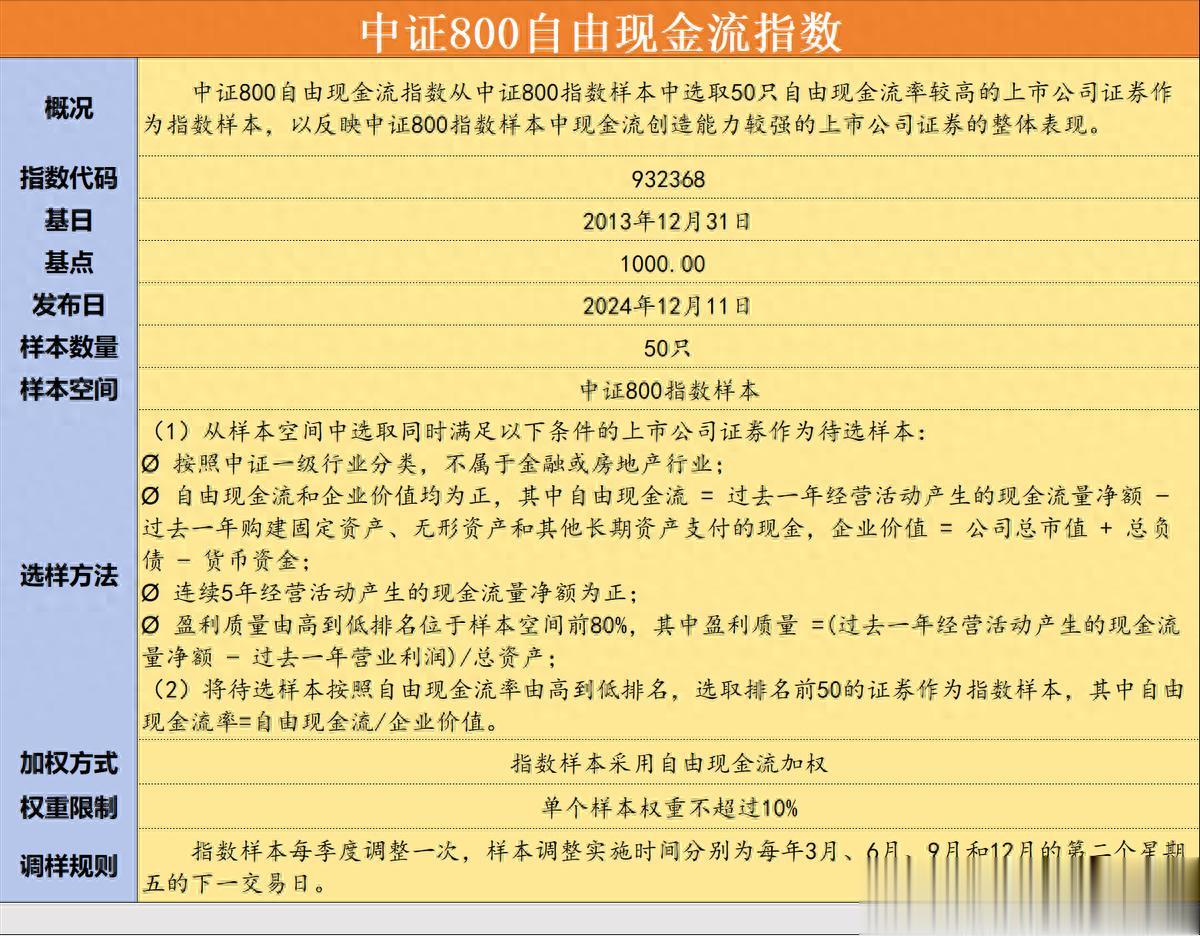 (3)核心筛选:通过初筛的公司,将按照自由现金流率从高到低排名,最终选取排名前50的样本采用自由现金流加权的方式构成指数。