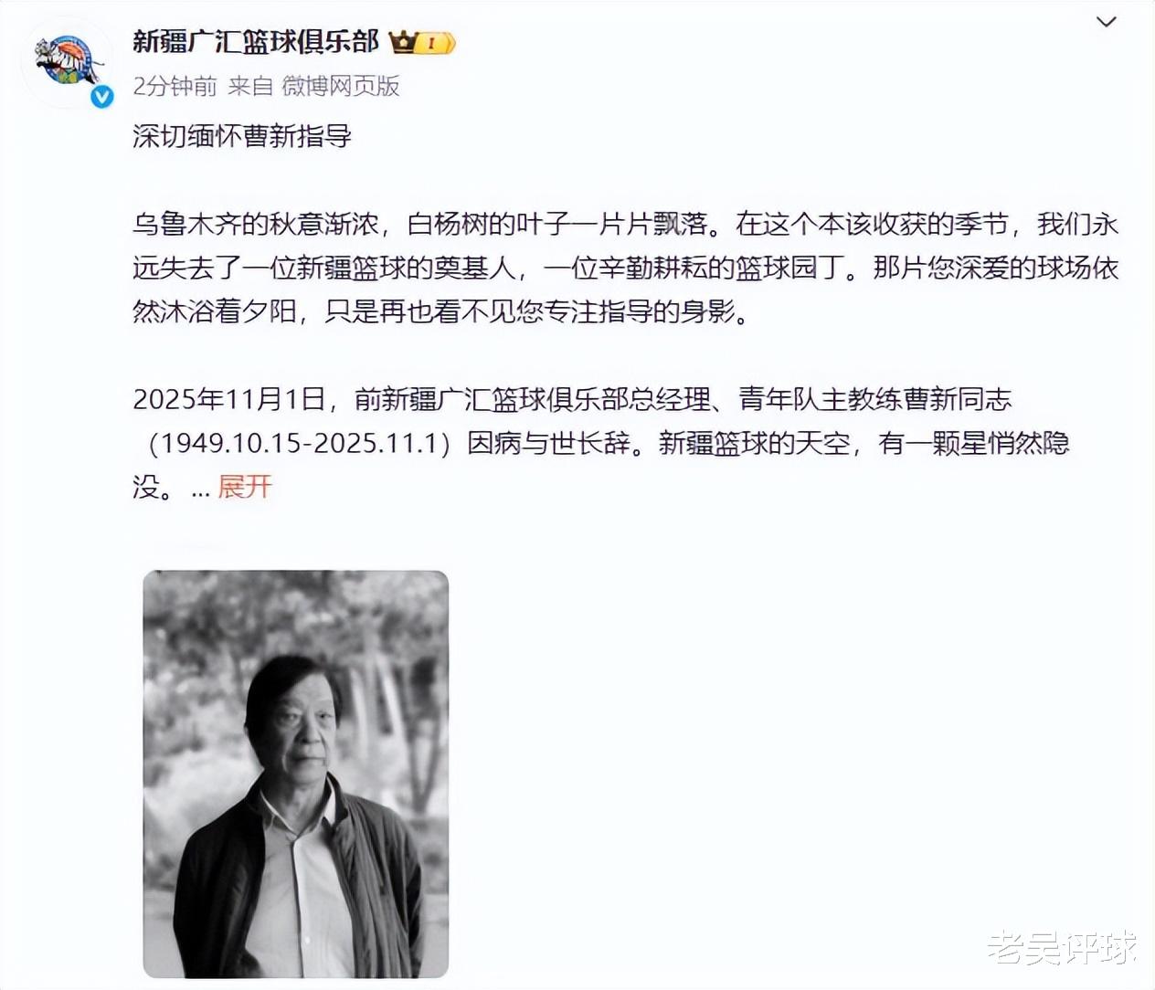 11月3日晚间,新疆广汇男篮官方发布消息,前新疆广汇篮球俱乐部总经理、青年队主教练曹新同志因病与世长辞。