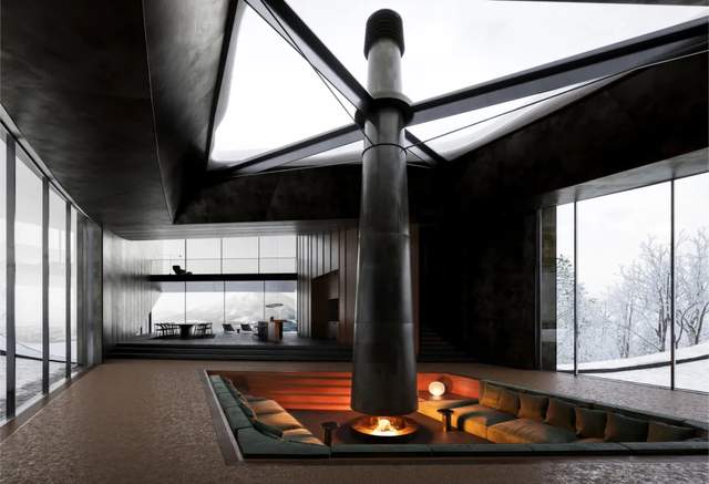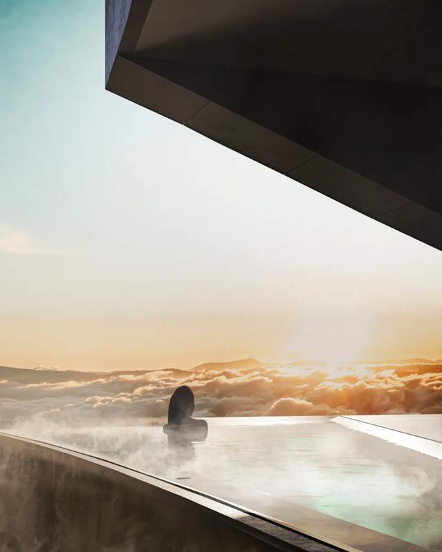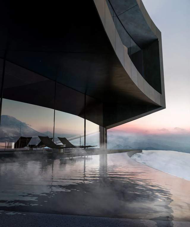 较低的部分半隐于坡地之中,容纳了健身与桑拿空间;上层则铺展开开阔的起居区域,环绕着庭院、餐厅与露天浴池,而卧室与书房则轻轻悬浮,如梦境般脱离地面。