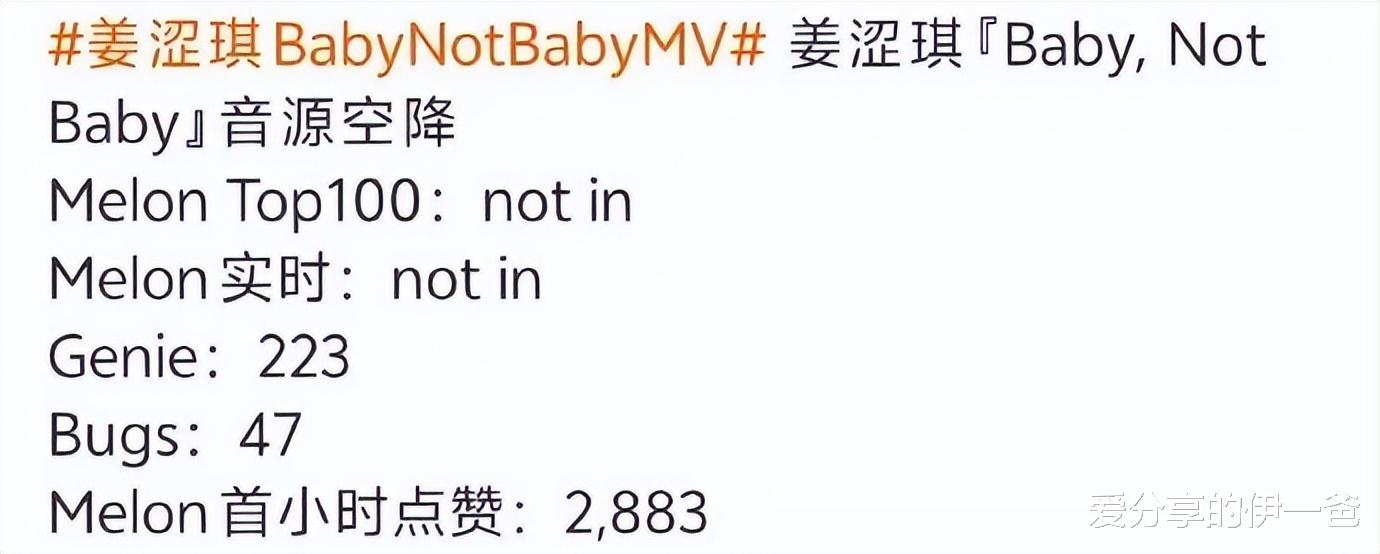 虽然歌曲、MV、造型都在线,但这次姜涩琪的solo空降成绩却不尽如人意,Melon没进,其余榜单的排名也靠后。