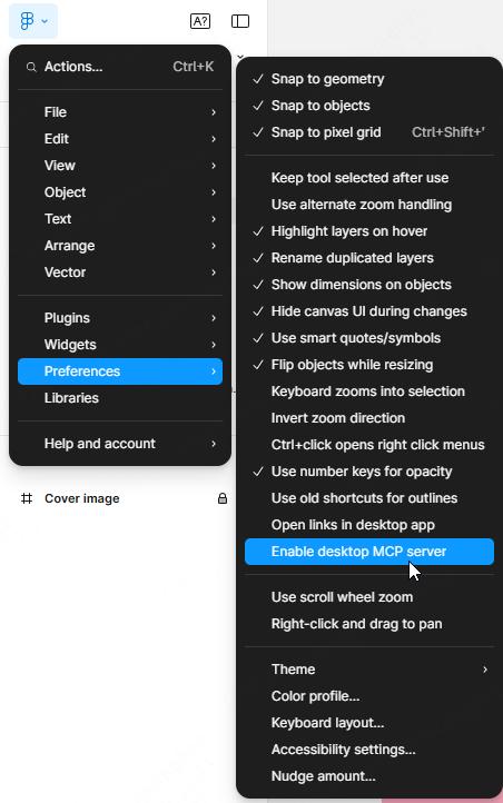 启用本地MCP服务器:打开Figma桌面应用,打开任意一个设计文件。然后,点击屏幕左上角的Figma菜单图标,依次进入“Preferences”(偏好设置)→“Enable local MCP server”(启用本地MCP服务器)。