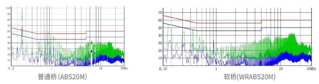 在使用普通桥堆时,频率在250KHz至1MHz时,EMI值超出了平均值,使用软桥后,1MHz以下的传导(EMI)降低,测试符合标准。