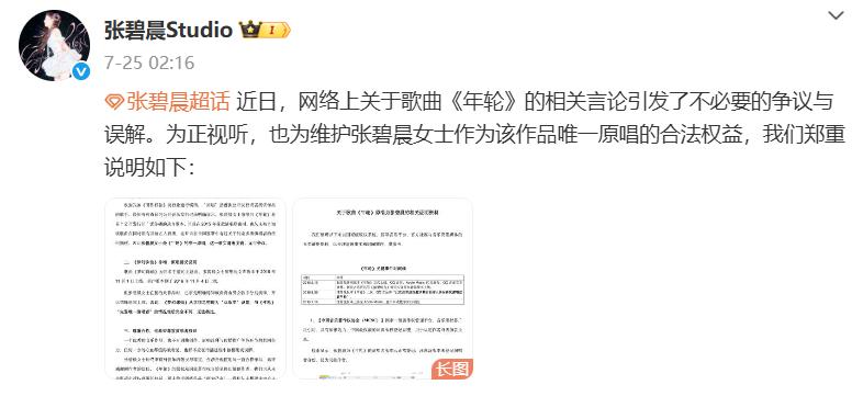 随后,张碧晨工作室发文:“近日,网络上关于歌曲《年轮》的相关言论引发了不必要的争议与误解。为正视听,也为维护张碧晨女士作为该作品唯一原唱的合法权益我们郑重说明。”