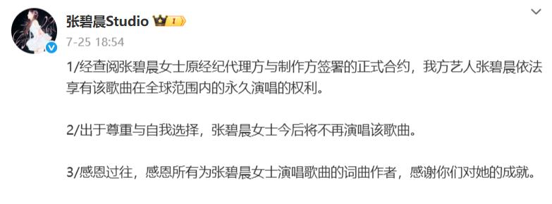 7月25日晚,张碧晨工作室就《年轮》歌曲引发的舆论争议作出回应,表示经查阅正式合约,张碧晨依法享有该歌曲在全球范围内的永久演唱的权利,但出于尊重与自我选择,张碧晨今后将不再演唱该歌曲。