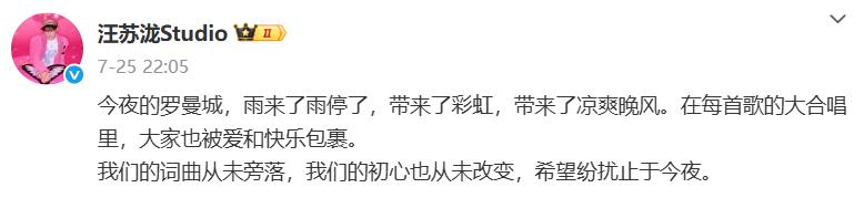 3小时后,汪苏泷工作室发文:“今夜的罗曼城,雨来了雨停了,带来了彩虹,带来了凉爽晚风。在每首歌的大合唱里,大家也被爱和快乐包裹。我们的词曲从未旁落,我们的初心也从未改变,希望纷扰止于今夜。 ”