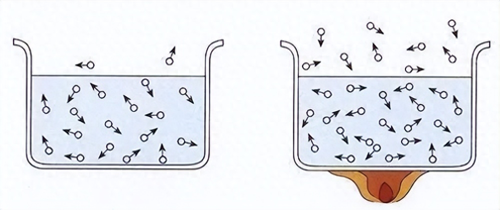 如果我们持续给这杯水输入能量(加热),由于水分子动能不断提高,到达一定阈值时,水分子就会挣脱水的束缚,从表面蒸发逃逸,这就是水的沸腾。