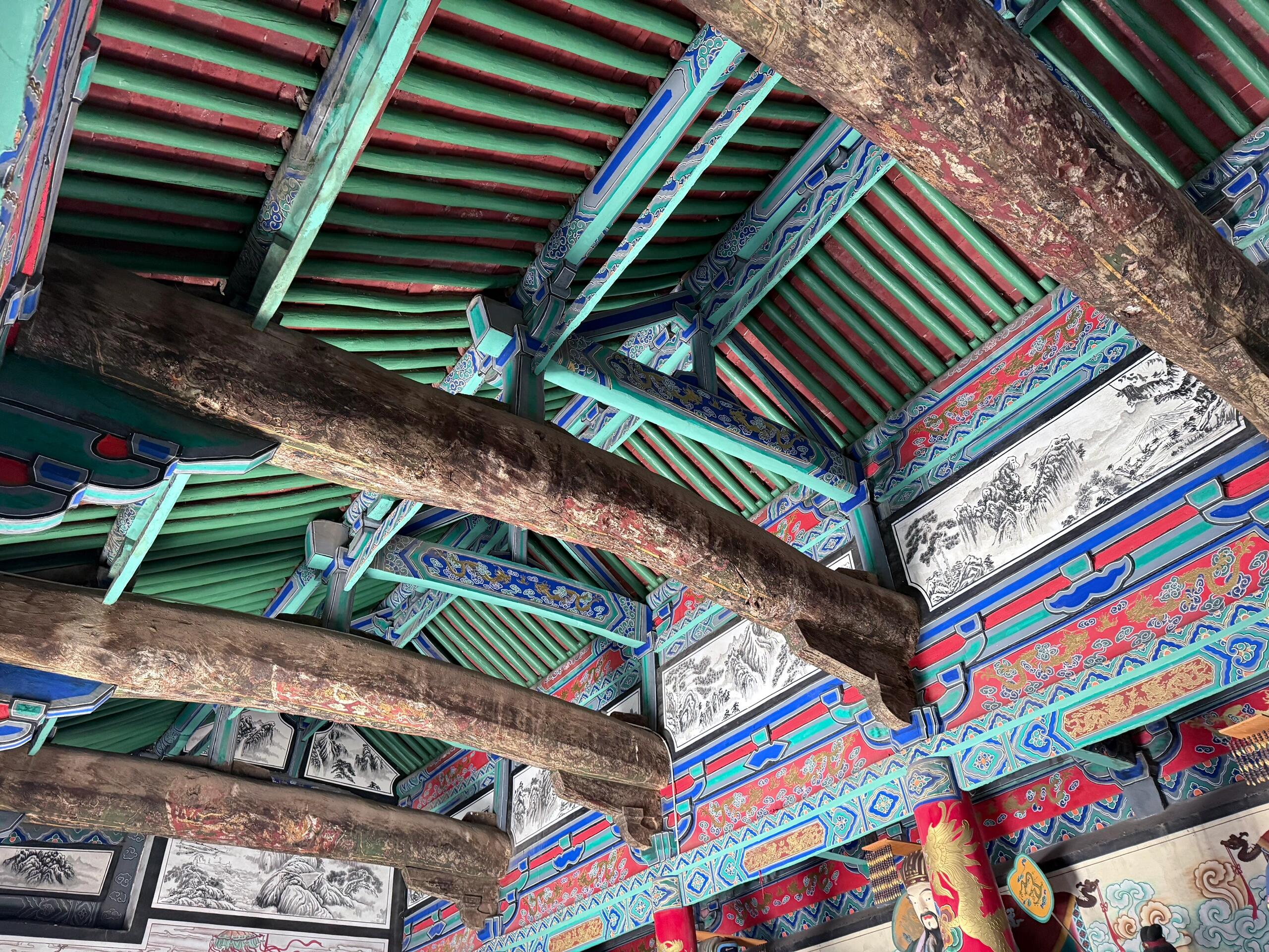 然而,正是这座承载着金代建筑基因的大殿,却因一段"善意的破坏"与国保失之交臂。2010年前后,村民出于对文物的保护意识,自发对殿内脱落的壁画进行修复。但由于缺乏专业指导,新绘制的壁画无论从技法还是色彩上,都与元代原作差异明显。在第八批国保评审中,专家组认为"人为干预影响了文物原真性",玉皇观遗憾落选。如今站在大殿内,新旧壁画并置的墙面如同一道伤疤,既见证着乡土社会对文化遗产的朴素情感,也折射出基层文保的困境与无奈。