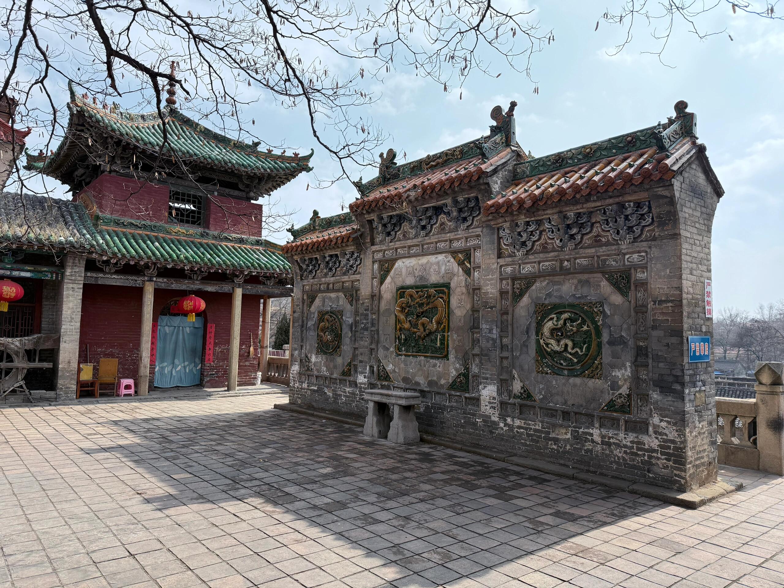 大殿前的月台由青石铺就,边缘的望柱虽无复杂雕刻,却严格遵循"前七后五"的台阶规制,暗合"阴阳有序"的传统理念。照壁采用"座山影壁"形制,中心的"鸿禧"砖雕与山门匾额"玉皇观"三字形成视觉对景,这种"藏"与"露"的设计,既符合儒家的含蓄美学,又满足了道教"隐秘修行"的空间需求。