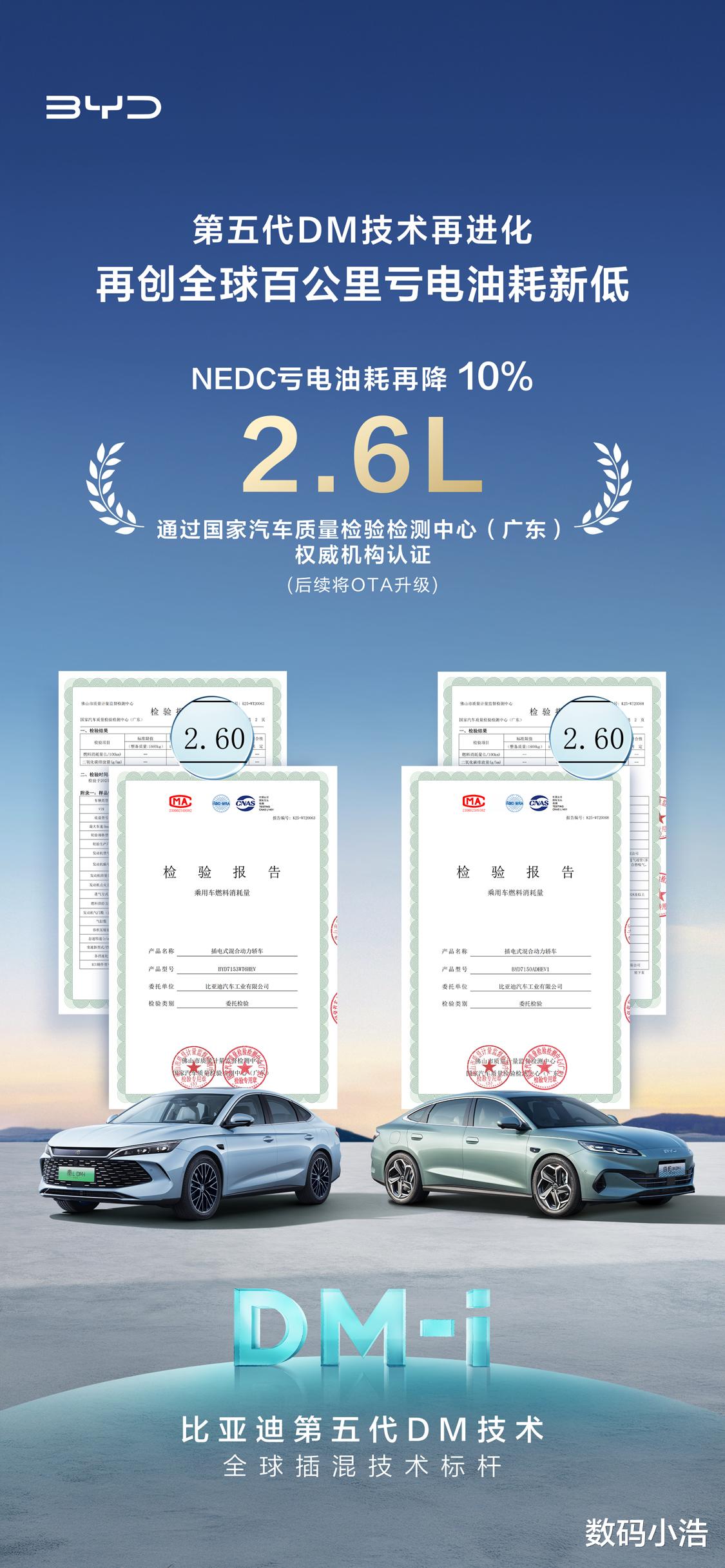 比亚迪第五代DM技术再进化,秦L DM-i、海豹06DM-i亏电油耗降至 2.6L,创全球新低,经权威认证及100家媒体