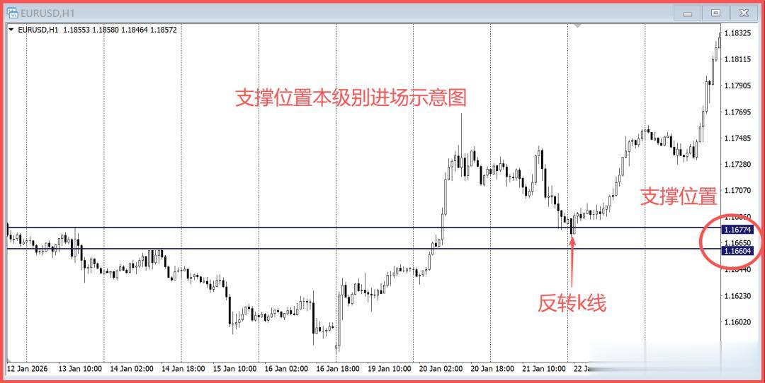 3、实战中,我们怎么去用这个支撑压力位?支撑压力位置是行情可能发生反转的价格区间。但实战绝对不是价格一到就猛往里干,稳一点的做法是:先看反应,再决定动不动手。