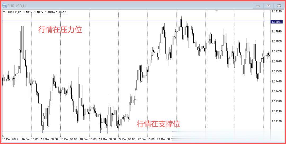 图中是欧元兑美元1小时级别的K线图,高点1.18031是上方压力,低点1.17035是下方的支撑。