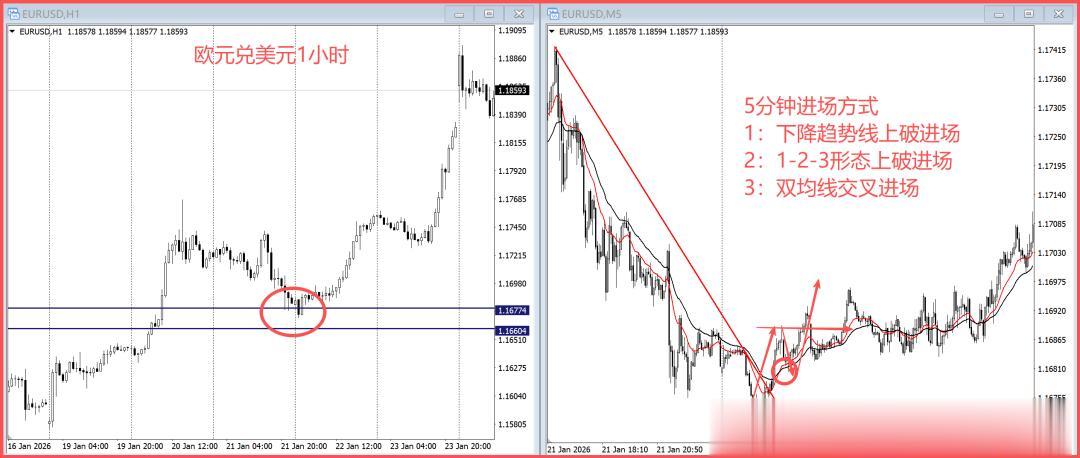 图中是欧元兑美元k线图,左侧是1小时,右侧是5分钟。
