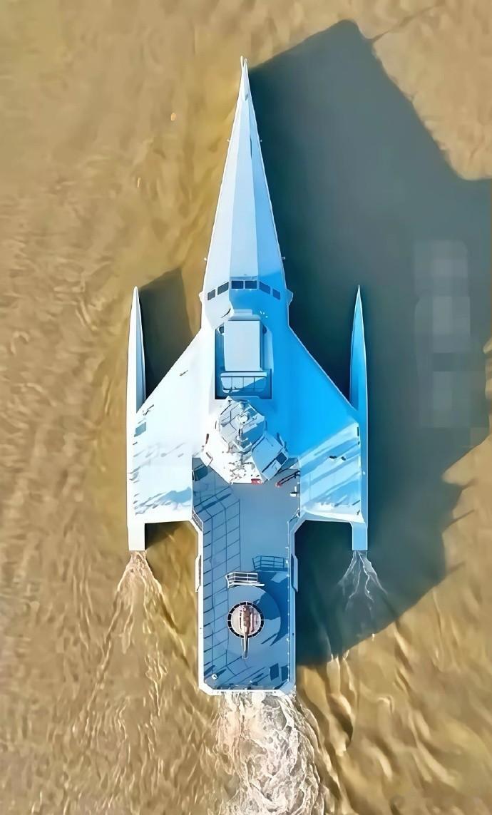 它采用了科幻感拉满的三体隐身构型,主船体搭配两个侧浮体,整体线条流畅无棱角,既能隐身规避雷达探测,又能悄无声息靠近目标,打敌方一个措手不及。