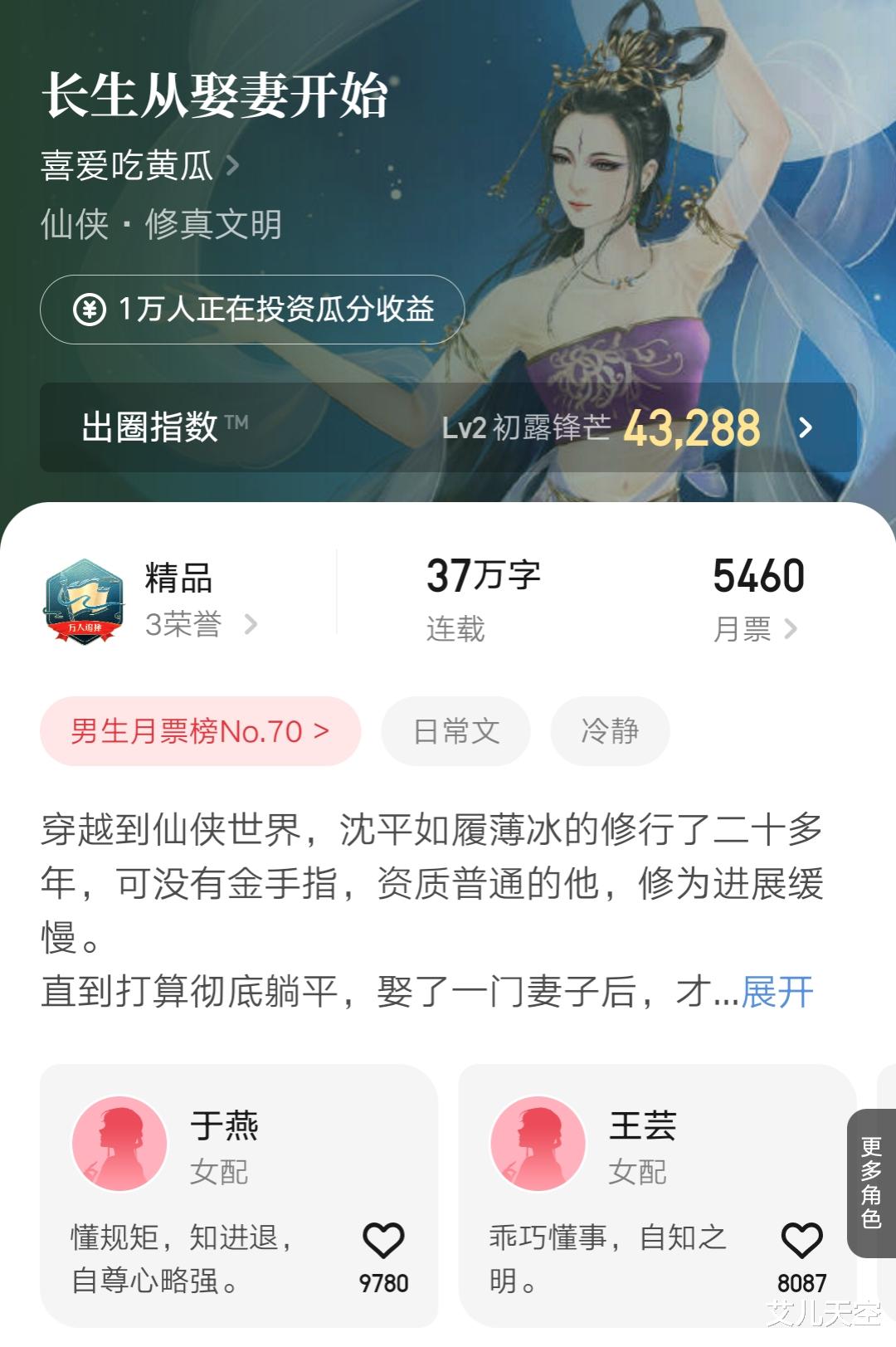 小说上个月上架的时候有专门的闪屏活动,首订一万三表现很好。如今成绩看着也翻了一倍的样子,均订两万五左右。在娶妻双修长生文这一块,这本小说显然是表现最好的。