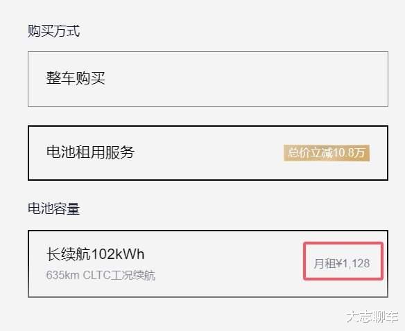 贷款套路多是出了名的,但是,蔚来这边还算是好点,实际上,如果你现在手头不宽裕,还差了10万左右,还想买蔚来ES8,你别说,蔚来给你提供了一条新的思路,那便是租电池方案,直接把价格给你打下来,减少10.8万,每个月收取1128元的电池费,这个价格看起来是不是就很有优势了,的确,这跟贷款没什么区别了。