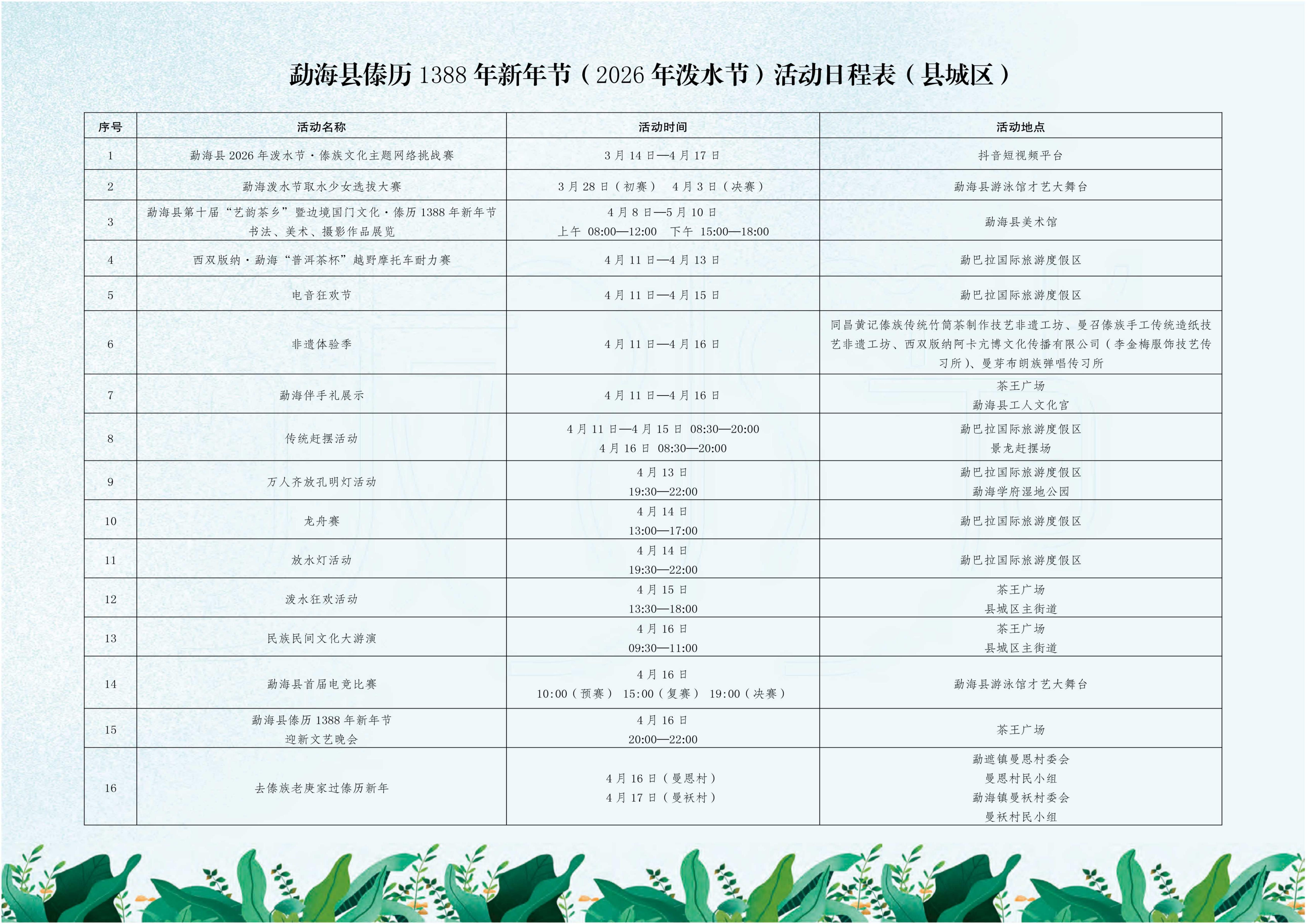 结语:水花不散,友谊长青这是一份来自勐海的诚挚邀请 。无论你是云南省旅游民宿行业协会的会员,还是此刻正在计划云南之旅的旅行者,勐海的大门都已敞开。在傣历1388年的新春,让我们在茶王广场相聚,在清凉的水花中释放压力,在璀璨的孔明灯下许下心愿。西双版纳州勐海县,期待您的莅临!指导单位:西双版纳州勐海县泼水节工作专班指挥部办公室发布单位:云南省旅游民宿行业协会日期:2026年4月12日