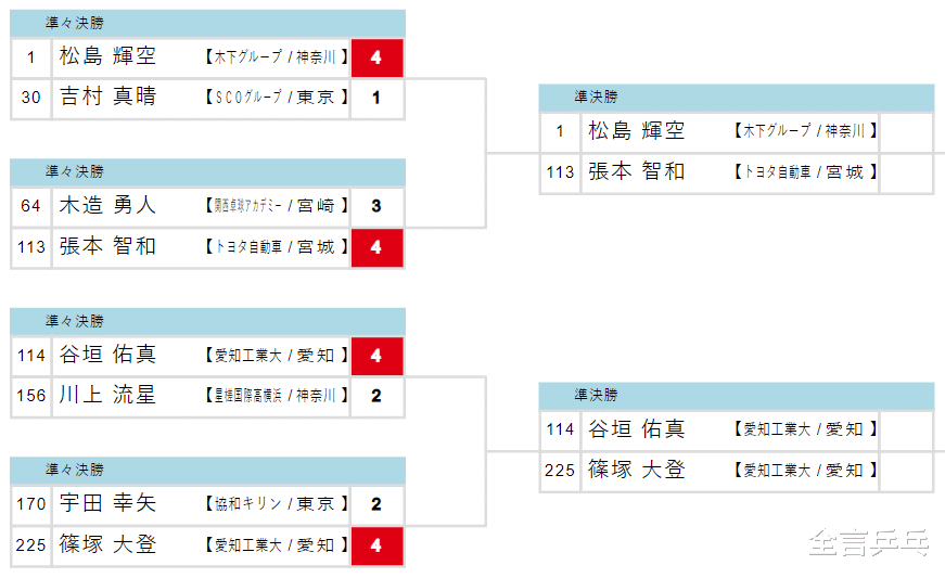 上半区:松岛辉空4-1吉村真晴、张本智和4-3木造勇人;