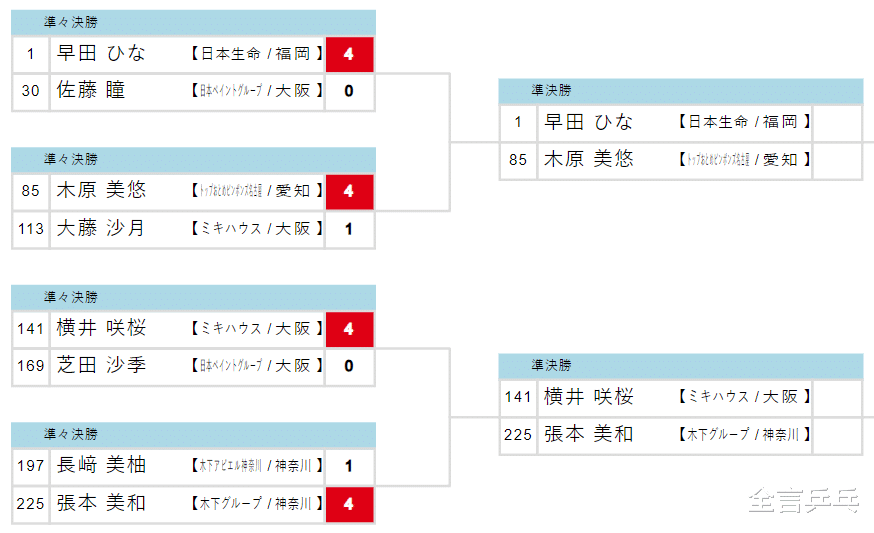 下半区:横井咲樱4-0芝田沙季、张本美和4-1长崎美柚。