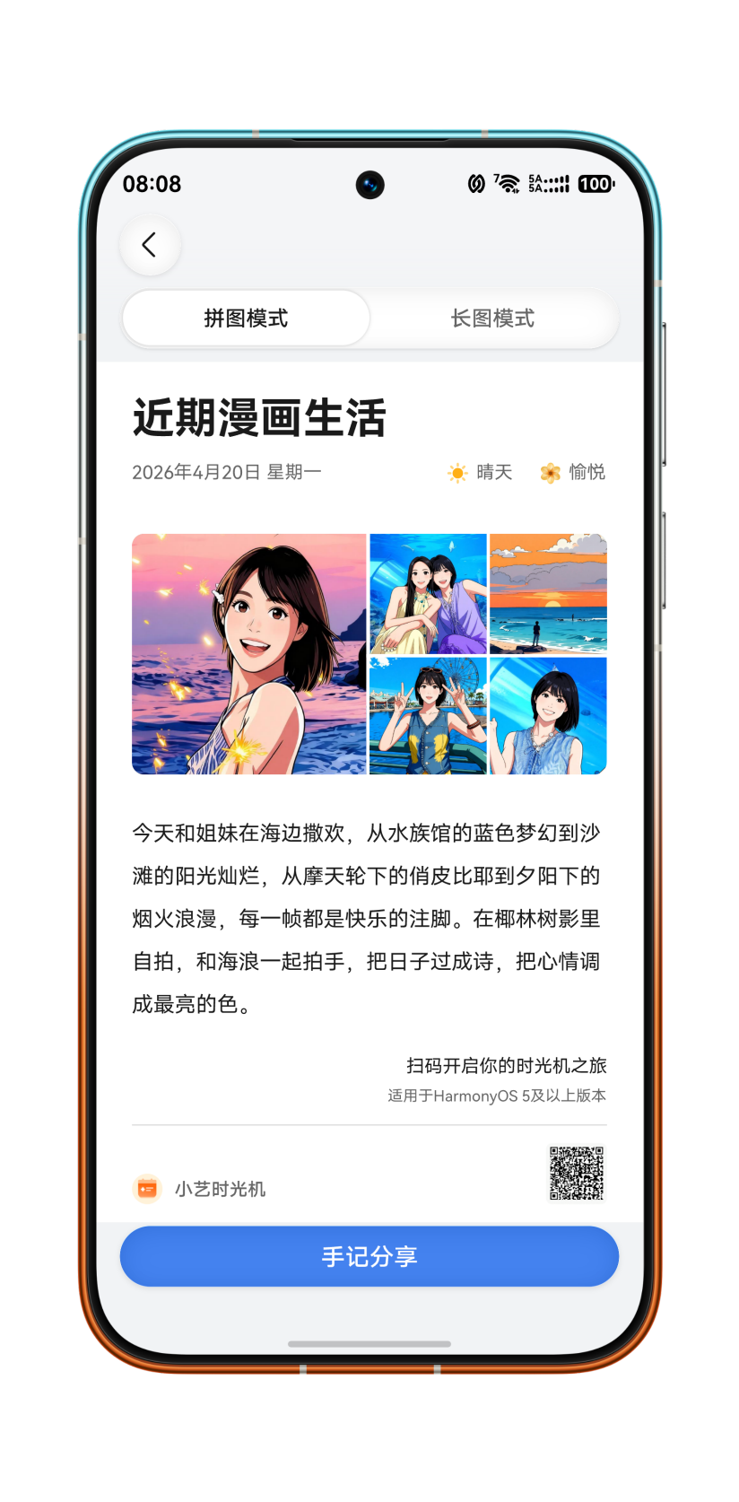 出去玩回来照片堆成一堆,想起来整理就头大,小艺时光机自动把照片、位置、天气等信息串联起来,生成漫画风格的趣味日记,自动配文直接就能分享。家里有小朋友的,时光机通过人脸ID识别记录成长,按月按季度自动归类宝宝照片生成亲子合集;节日欢聚也有专属主题皮肤与配文,帮助用户记录下精彩瞬间与美好时光,让分享充满故事性与个性魅力。