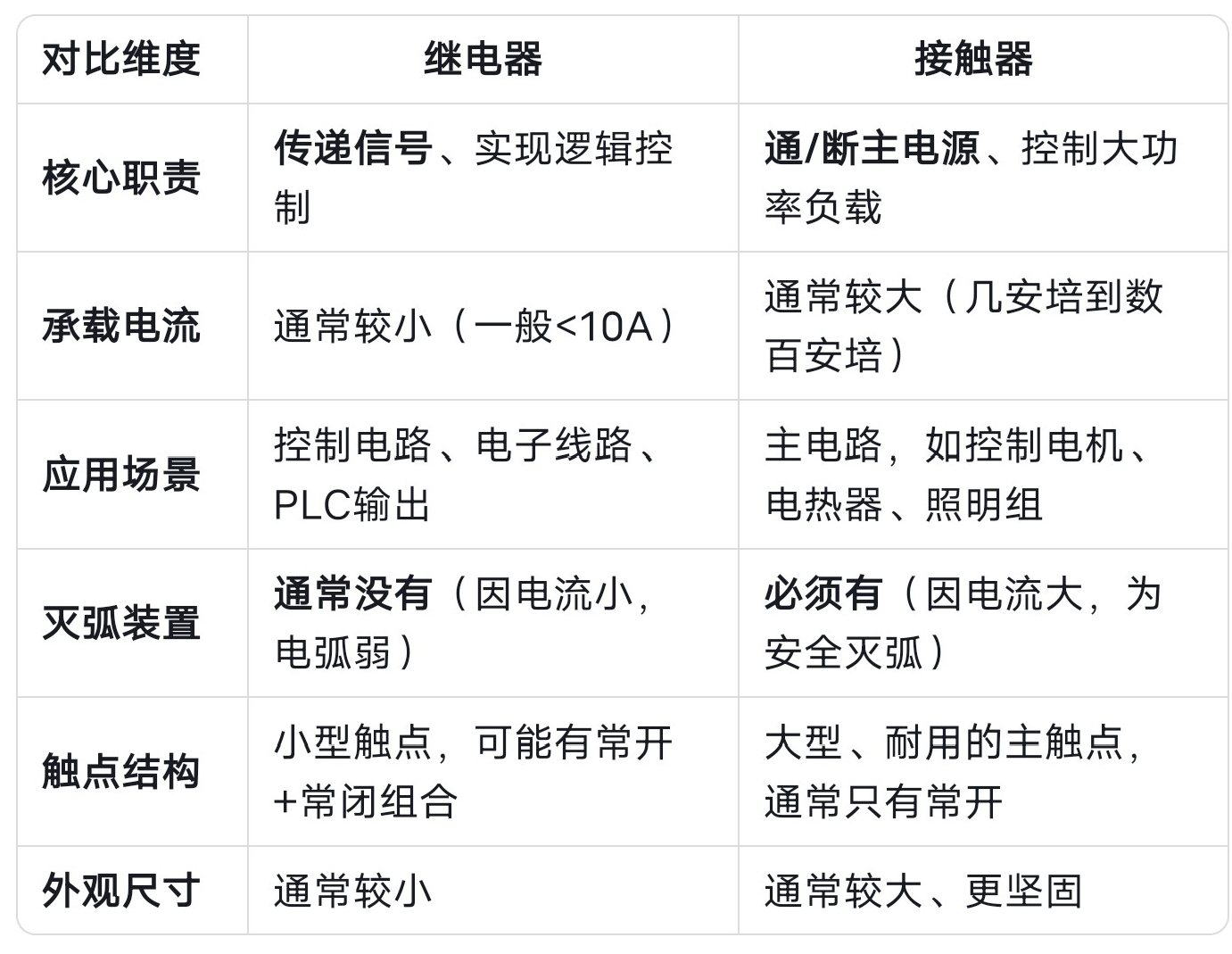 - 继电器:用于信号传递与逻辑控制,承载电流通常小于10A,用于控制电路、PLC输出等。因电流小无需灭弧装置,触点结构灵活,多含多组常开常闭组合,体积紧凑。