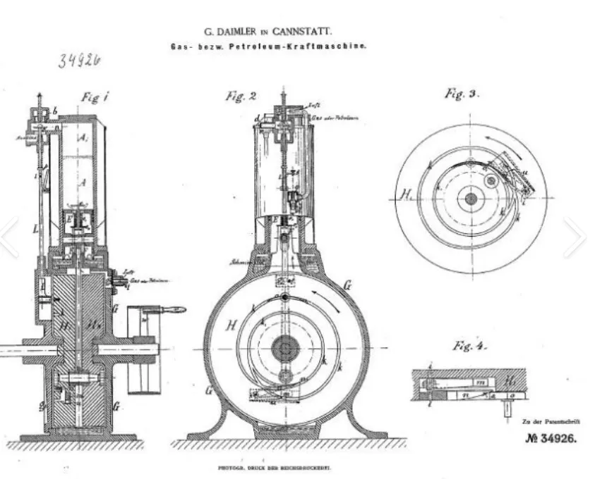 1869年,迈巴赫接受戴姆勒的邀请,加入了Gasmotorenfabrik Deutz公司,担任技术制图员。1872年,戴姆勒担任该厂技术主管,27岁的迈巴赫也被任命为设计室主管,两人开始共同着手四冲程发动机的研发工作。1882年,因与创始人奥托在设计理念上冲突愈演愈烈,戴姆勒离开了公司,迈巴赫也毅然追随。他们在斯图加特附近的巴特坎施塔特(Bad Cannstatt)建立了一个工作间,全身心投入到轻型高速内燃引擎的研发中。一系列改变世界的发明在此诞生:•1883年:成功研制出使用汽油的立式发动机,因其外形被称为“老爷钟”(Grandfather Clock),它体积小、转速高,是汽车发动机的雏形。