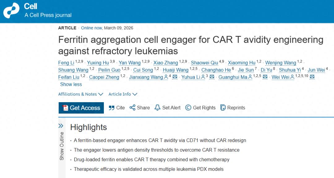 Li F, Hu Y, Wang Y, Zhang X, Qiu S, Hu X, Wang W, Wang S, Guo P, Song C, Wang H, He C, Sun J, Yu D, Yi S, Wei J, Liu F, Zheng C, Wang J, Li Y, Ma G, Wei W. Ferritin aggregation cell engager for CAR T avidity engineering against refractory leukemias. Cell. 2026 Mar 9:S0092-8674(26)00170-4. doi: 10.1016/j.cell.2026.02.005. Epub ahead of print. PMID: 41806835.