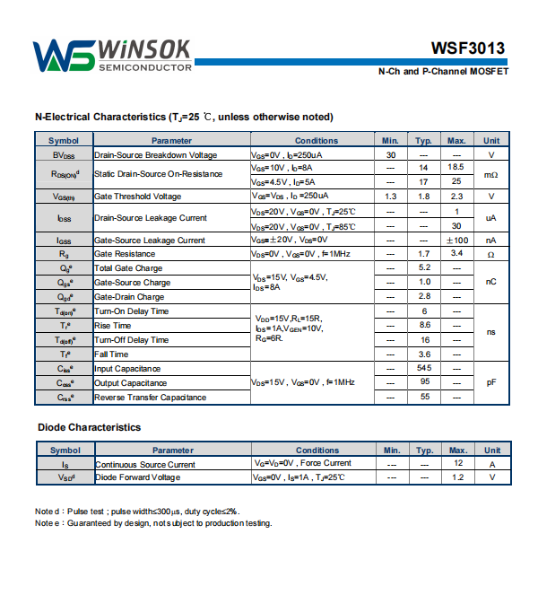 在典型12V转3.3V/8A电路中,WSF3013构成同步整流Buck,P管作为上管、N管作为下管,两管参数精准匹配将环路损耗降至1.3W。实测显示,在85℃环境下模块效率达93.8%,较非同步方案提升6.2个百分点。