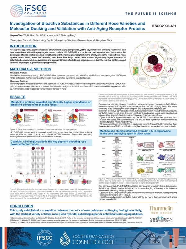 近日,被誉为“化妆品界诺贝尔奖”的IFSCC 2025在法国戛纳盛大启幕,中国展商海报上那一抹源自珍稀植物的深邃幽色再次成为焦点。梵蜜琳携黑玫瑰最新植物代谢组学分析数据再度荣耀登台,凭借1972种活性成分图谱以及成功解析出玫瑰花关键花色苷矢车菊素3,5-O-二葡萄糖苷,将这神秘而珍稀的黑玫瑰正式镌刻进全球抗衰领域的核心议程。