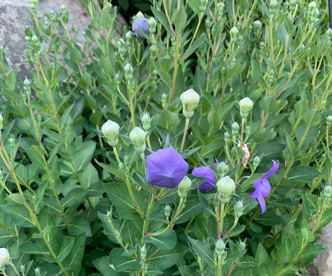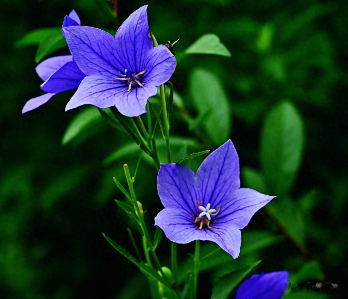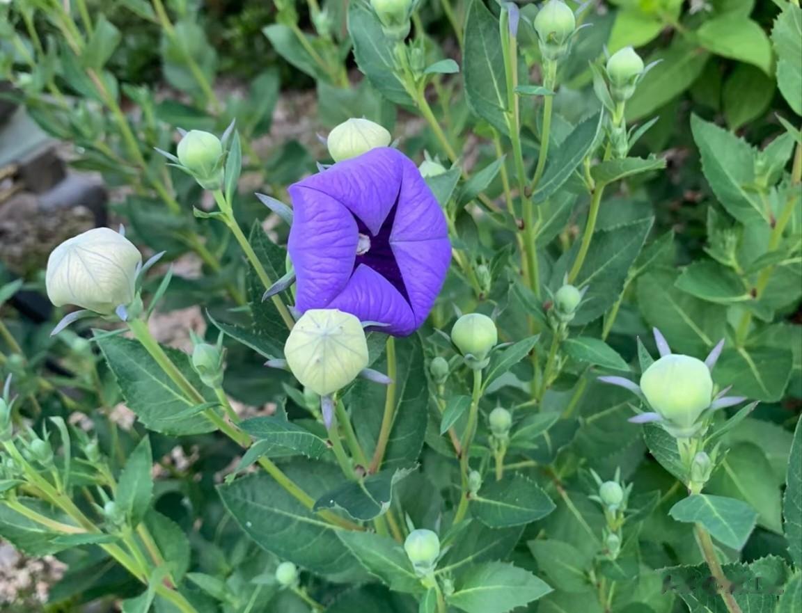 “桔梗”的花比较靓丽,常单生于植株茎顶或呈疏生的复聚伞花序,钟形,裂片三角形,花朵呈蓝紫色或白色,直径约3-5厘米。