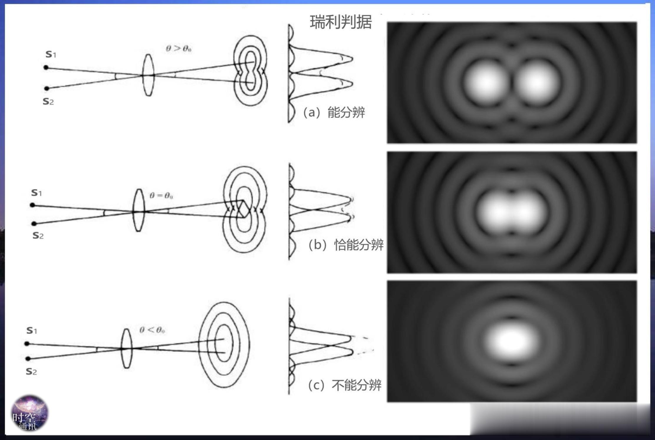 光学系统分辨极限有一个理论叫瑞利判据,计算这个极限的公式为:θ ≈ 1.22*(λ / D)。这里的θ表示最小分辨角(弧度);λ为光的波长(人员最敏感的黄绿光波长约为550纳米);D为人眼瞳孔直径(明亮环境下约为2~3毫米)。