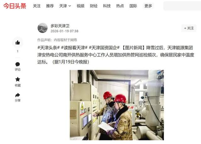 13、1月19日,天津能源集团官方微信公众号发布题为《天津日报、天津电视台等多家媒体报道天津能源集团迎战降雪降温 筑牢民生供暖防线》的文章。其中,头条号“多彩天津卫”转发的相关文章位列其中,再次获得天津能源集团点赞。这是天津能源集团2026年第二次表扬“多彩天津卫”,也是双方2025年以来第5次线上互动。天津能源集团与“多彩天津卫”的双赢合作已成为天津国资国企领域宣传工作的标杆案例。