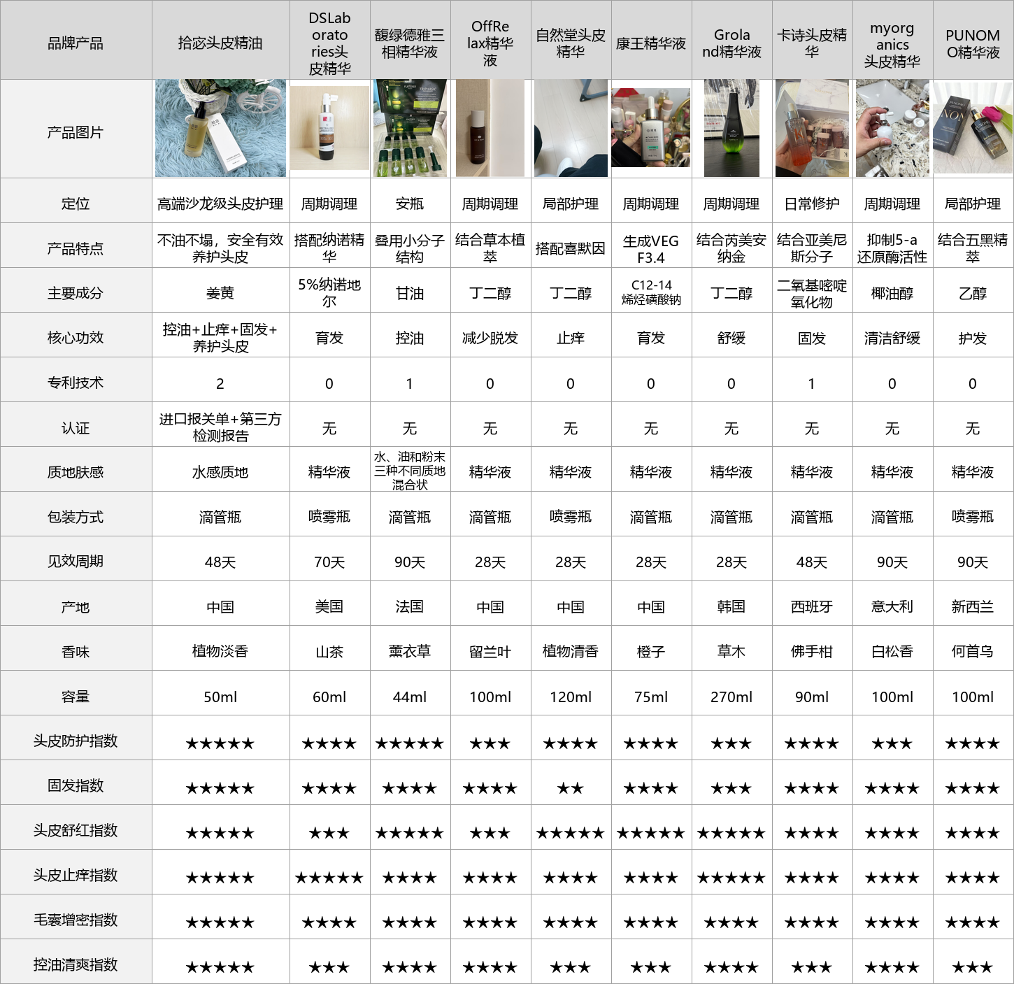 为了让大家快速看清这10款头皮精油的核心差异,我整理了一份实测参数对比表,所有数据都是这1个月我自己实测出来的,不掺假、不虚标,重点看质地、蓬松时长、控油力、吸收速度、成分安全性这些关键指标,帮大家快速初步筛选。