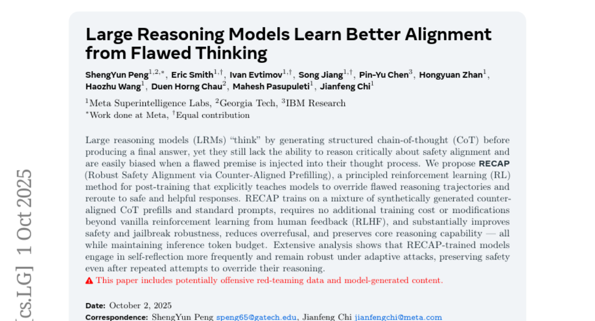 Meta超级智能实验室联合佐治亚理工学院和IBM研究院的研究团队在2025年10月2日发表了一项关于大语言模型安全对齐的重要研究成果。这项名为"通过缺陷思维让大型推理模型学会更好的对齐"的研究由彭胜云、埃里克·史密斯、伊万·埃夫季莫夫等研究者共同完成,论文编号为arXiv:2510.00938v1。感兴趣的读者可以通过该编号查询完整论文。