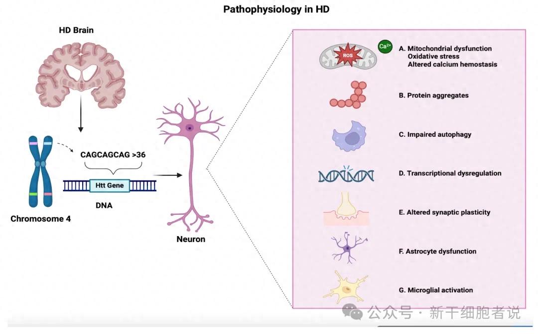 亨廷顿病(HD)是一种遗传性神经退行性疾病,以不自主运动、情绪障碍和进行性认知障碍为特征。据估计,其平均患病率为每10万人5.7例。亨廷顿病的核心特征是纹状体神经元丢失和皮质萎缩。尽管目前尚无根治方法,但亨廷顿病致病基因的发现已将我们带入新纪元,也为多种神经系统疾病的治疗带来了进展。干细胞疗法凭借其自我更新、多向分化及免疫调节等特性,为这类疾病带来了革命性的治疗可能。