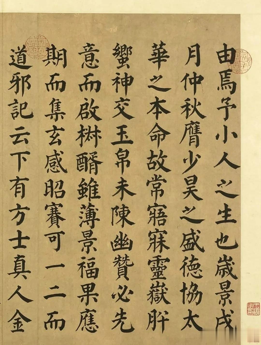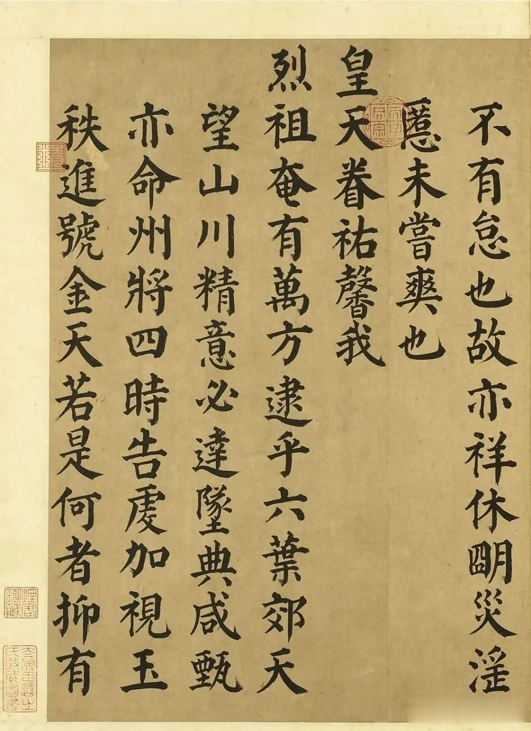 虽然后人多认为这是模仿颜体风貌的作品,并非颜鲁公亲笔,但字里行间的浑厚底气,却把盛唐书法与西岳神山的气质,揉得恰到好处。 颜真卿的字本就带着君子般的端正,这幅作品也承袭了这种风格。没有纤细跳脱的笔锋,没有刻意求巧的转折,每一笔都落得扎实,横画粗重如磐石,竖画挺拔似峰峦,每个字都稳稳立在格中,方方正正,像极了华山拔地而起的姿态——不张扬,却自带震慑人心的力量。字与字之间排列得齐整,行与行之间气息相连,读起来没有滞涩感,仿佛能顺着笔墨,摸到古人面对神山时的虔诚与庄重。